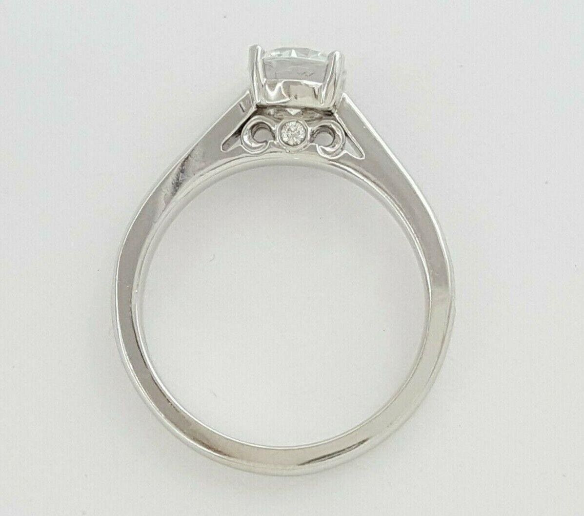 The ring weighs 3.7 grams, size 6.25, the shank is 14k white gold & the head is platinum. The center stone a cubic zirconia display stone, and the mounting will fit a diamond between 0.65-0.95 ct or a stone around 5.7-6.3 mm. The ring mounting has 22 Natural Round Brilliant cut diamonds weighing approximately 0.22 ct, G-H in color, SI1-SI2 in clarity. We can resize this ring to most finger sizes.