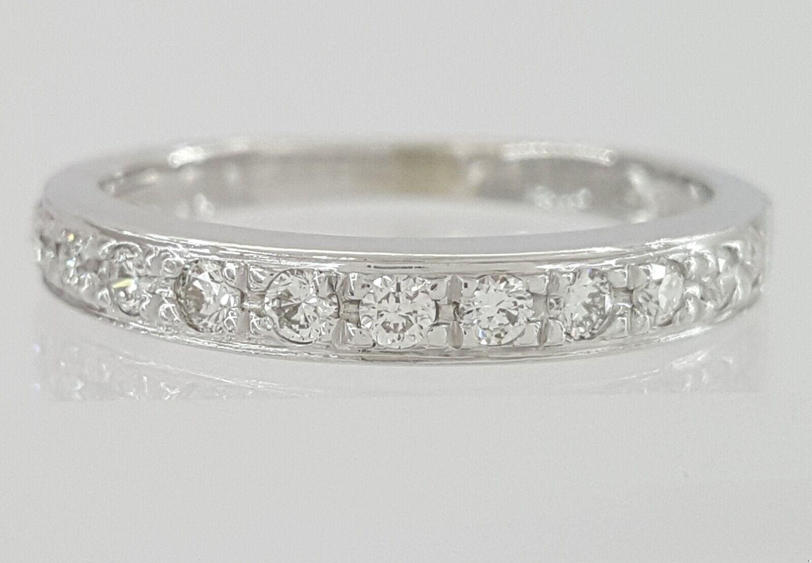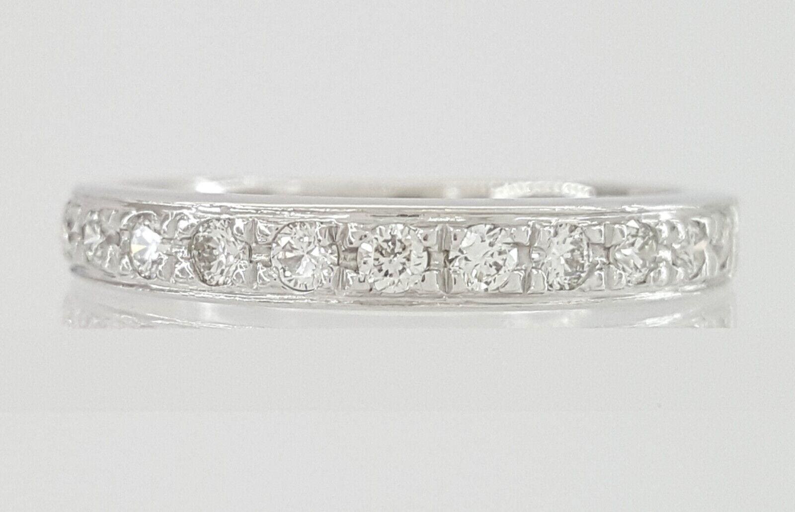 The ring weighs 1.8 grams, size 4.5, 2.8 mm wide, there are 12 Natural Round Brilliant Cut diamonds measuring around 1.75 mm in diameter, weighing approximately 0.25 ct, G-H in color, VS1-SI1 in clarity.
