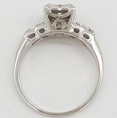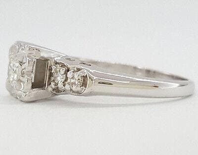 You are purchasing a 0.32 ct Antique / Vintage 14K White Gold Round Brilliant Cut Diamond Engagement Ring. The ring weighs 2.9 grams, size 6, the center stone is a Natural Round Brilliant Cut diamond weighing approximately 0.20 ct, H-I in color, VS2-SI1 in clarity. There are 4 Single Cut side diamonds weighing approximately 0.12 ct, G-I in color, VS1-SI1 in clarity. The ring is stamped "FR 14KT PAT-V".