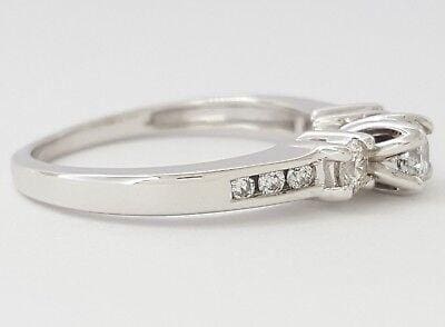 There are 3 Natural Round Cut diamonds weighing 0.34 ct, F in color, SI2 in clarity. The ring also contains 6 Natural Round Brilliant Cut side diamonds weighing 0.11 ct total weight, H-I in color, VS2-SI1 clarity. The ring is stamped "14K".