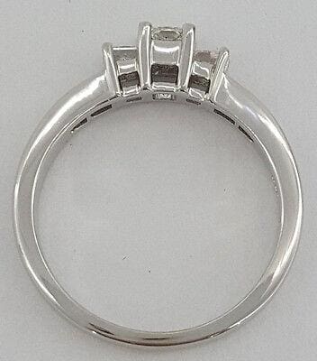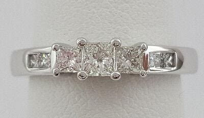 You are purchasing a 0.52 ct total weight 14k White Gold Three Stone Princess Cut Diamond Engagement Ring. The ring weighs 3.8 grams, size 7, there are 3 Natural Princess Cut Main Diamonds & 4 Natural Princess Cut diamonds on the shank, all together weighing ~0.52 ct total weight, G-H in color, VS2-SI2 in clarity. The ring is stamped "14K .52" & "WOC".
