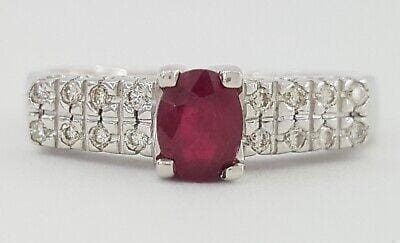 You are buying a 0.57 ct Total Weight 18K White Gold Oval Cut Ruby & Diamond Engagement Ring. The ring weighs 4.2 grams, size 6.5, the center is a Natural Oval Cut Red Ruby weighing 0.41 ct. There are 16 Natural Round Brilliant Cut Diamonds weighing approximately 0.16 ct, H-I in color, VS2-SI1 in clarity. The Ring is Stamped "750 R 0.41".