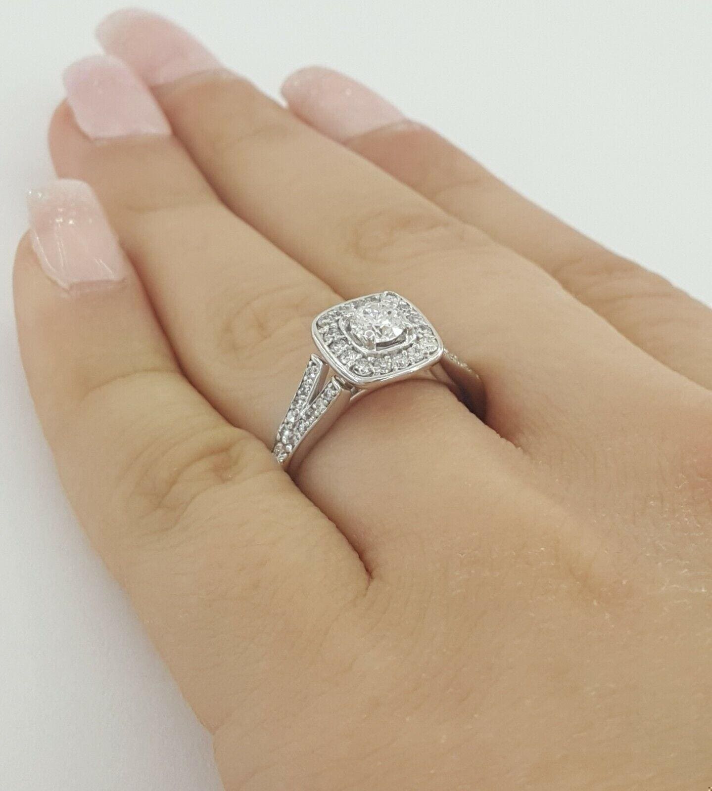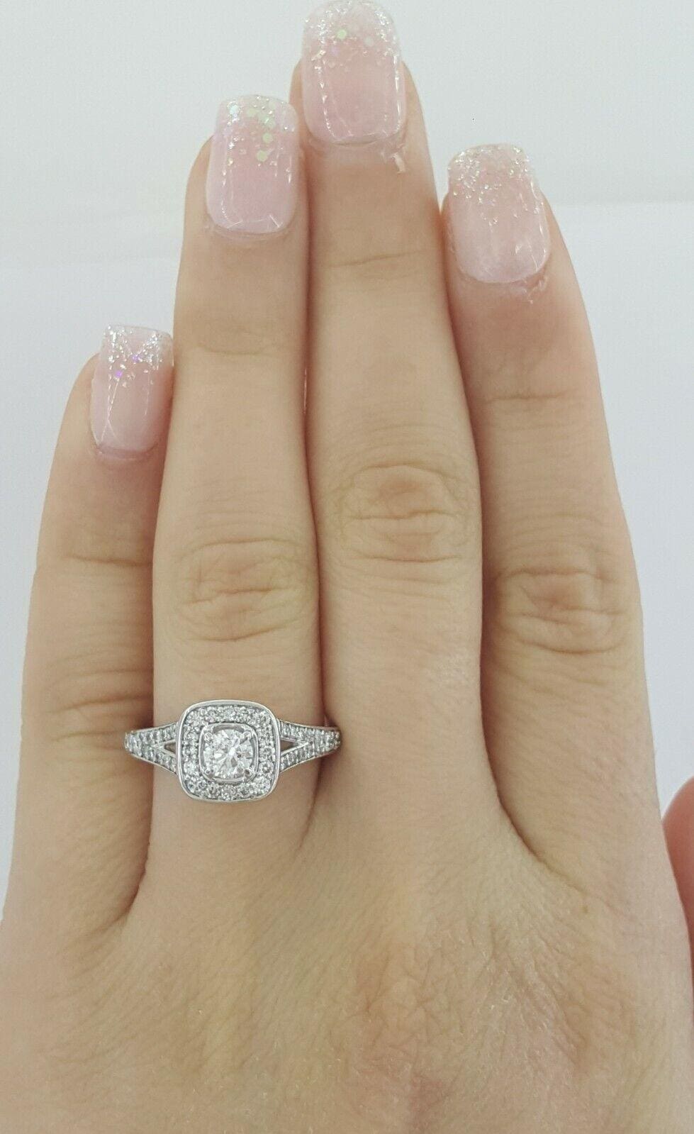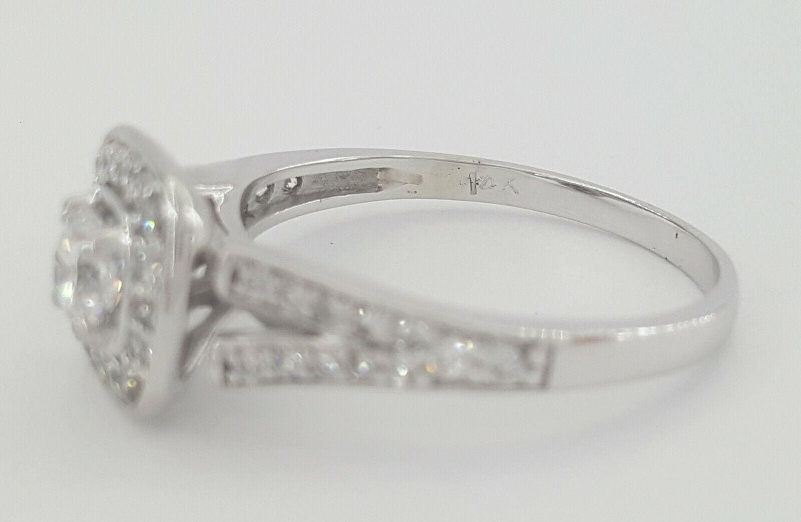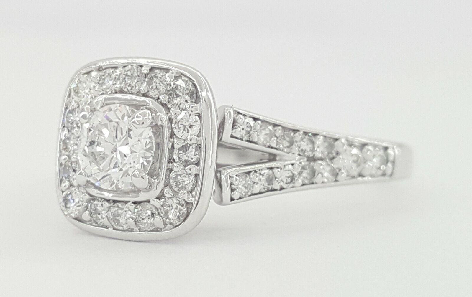 You are Purchasing a 0.81 ct Total Weight 14k White Gold Round Brilliant Cut Diamond Halo Split Shank Engagement Ring.