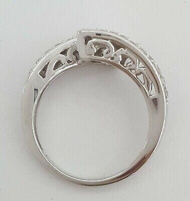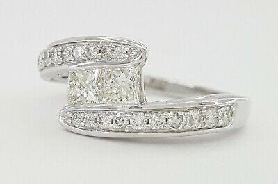 The ring weighs 4.5 grams, size 6.75, contains two natural Princess Brilliant Cut main diamonds weighing approximately 0.6 ct, G-H in color, SI1 & I1 In clarity. There are 20 Round Brilliant Cut diamonds weighing approximately 0.35 ct, G-H in color, VS2-I1 In clarity.