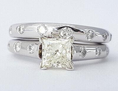 Both rings are size 6.5, weigh 9.5 grams, the center stone is a Natural Princess Cut diamond weighing 0.91 ct, J-K in color, VS2 in clarity. There are 13 Round Brilliant Cut side diamonds weighing 0.26 ct, F-G in color, SI3-I1 in clarity.