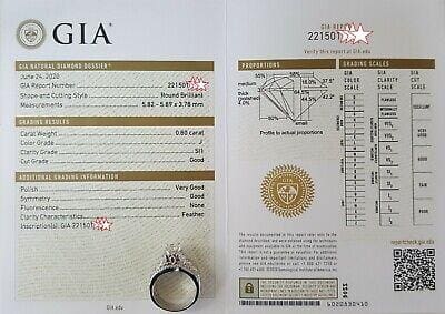 The center stone is Round Brilliant Cut Diamonds weighing 0.80 ct, J in color, SI1 in clarity, Good Cut, Very Good Polish, Good Symmetry. The measurements of the center stone are 5.82 - 5.89 x 3.78 mm graded and gridle inscribed by "GIA 221501****". The engagement ring also contains 20 Round Brilliant Cut diamonds weighing ~0.25 ct, H-I color, SI1-I1 in clarity.