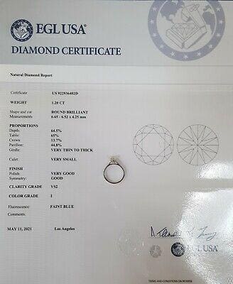The ring weighs 2.5 grams, size 5.75, the center stone is a Natural Round Brilliant Cut diamond weighing 1.20 ct, I in color, VS2 in clarity. There are 16 Natural Round Brilliant Cut Side Diamonds weighing 0.32 ct, G-H in color, VS1-VS2 in clarity.