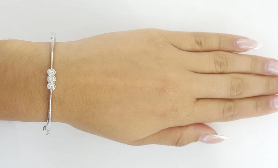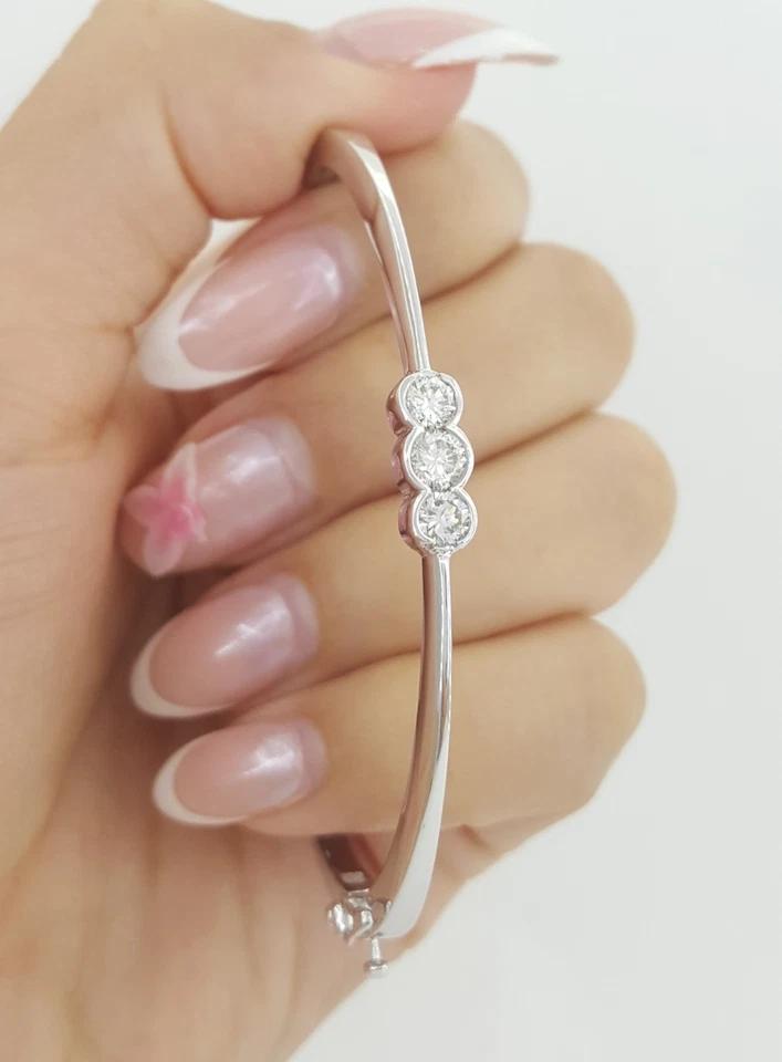 The bracelet weighs 14.5 grams, 6.5" inner diameter, fits a medium size wrist, 5 mm Wide, 3.8 mm thick. There are 3 Natural Round Brilliant Cut Diamonds weighing ~ 0.57 ct, H-I in color, SI in clarity.