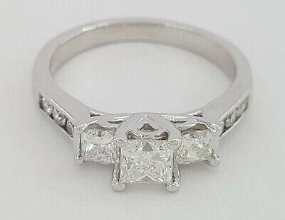 You are purchasing a 1 ct total weight White Gold 14k Princes & Round Cut Diamond Engagement Ring. The ring weighs 3.6 grams, size 6.25, the center is a Natural Princess Brilliant Cut Diamond weighing approximately 0.5 ct, G-H in color, VS2-SI1 in clarity. The two Natural Princess Cut diamonds weighing approximately ~0.32 ct total weight, G-H in color, VS2-SI1 in clarity. There are 6 Natural Round Brilliant Cut side diamonds weighing 0.18 ct total weight, G-H in color, VS2-SI1 clarity. The ring is stamped "14k" on the inside of the ring.