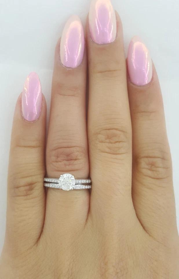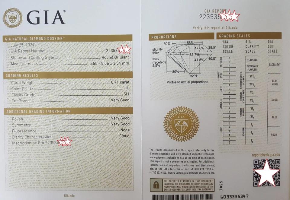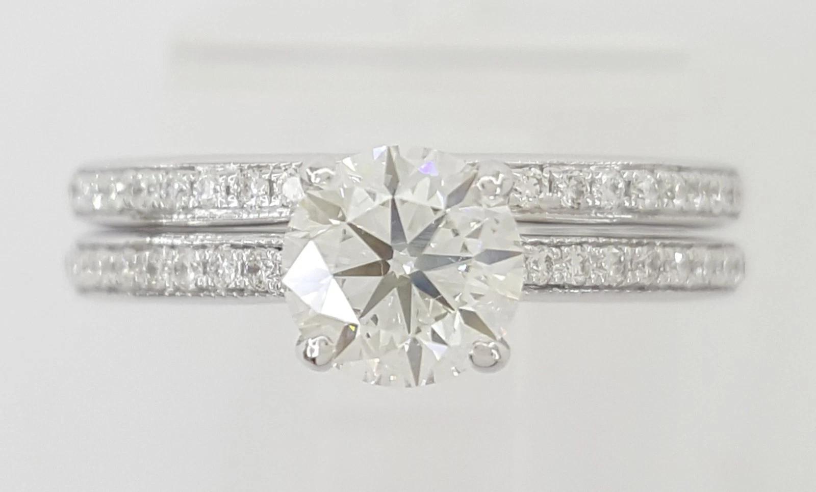 The engagement ring set weighs 5 grams, size 4, the center stone is a Natural 0.71 ct Round Brilliant Cut diamond weighing, H in color, SI1 in clarity, Very Good Cut, Very Good Polish, Very Good Symmetry, Graded and Gridle inscribed by GIA "GIA 223535****"