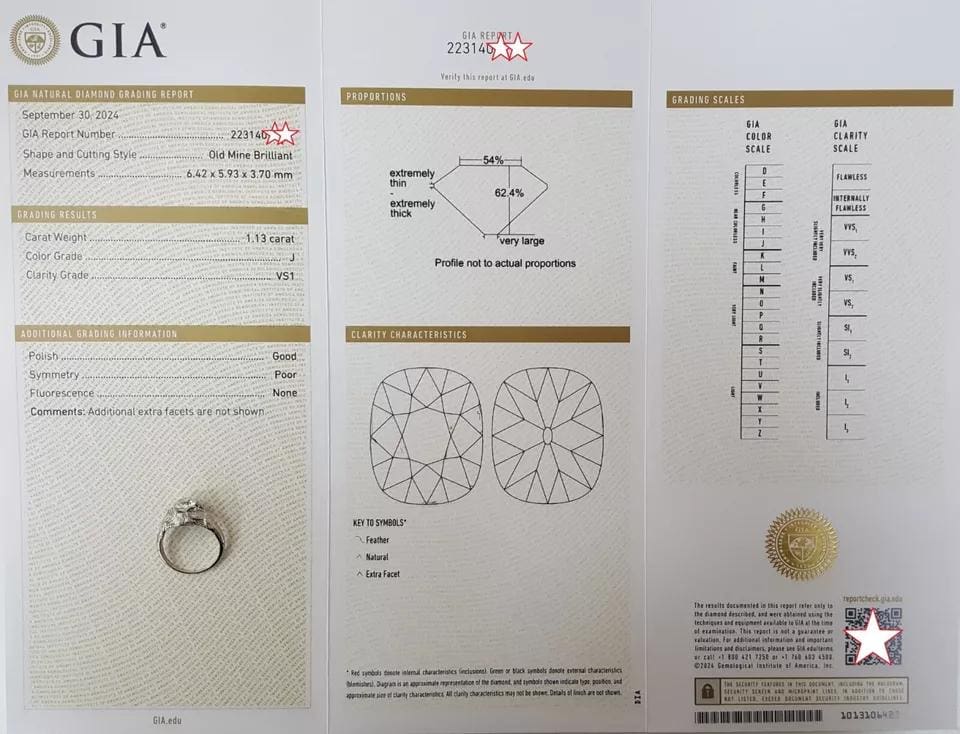 The ring is size 5.5, weighs 3 grams, the center stone is a Natural 1.13 ct Old Mine Cut diamond weighing, J in color, VS1 in clarity, comes w/ GIA Certificate for the center diamond.