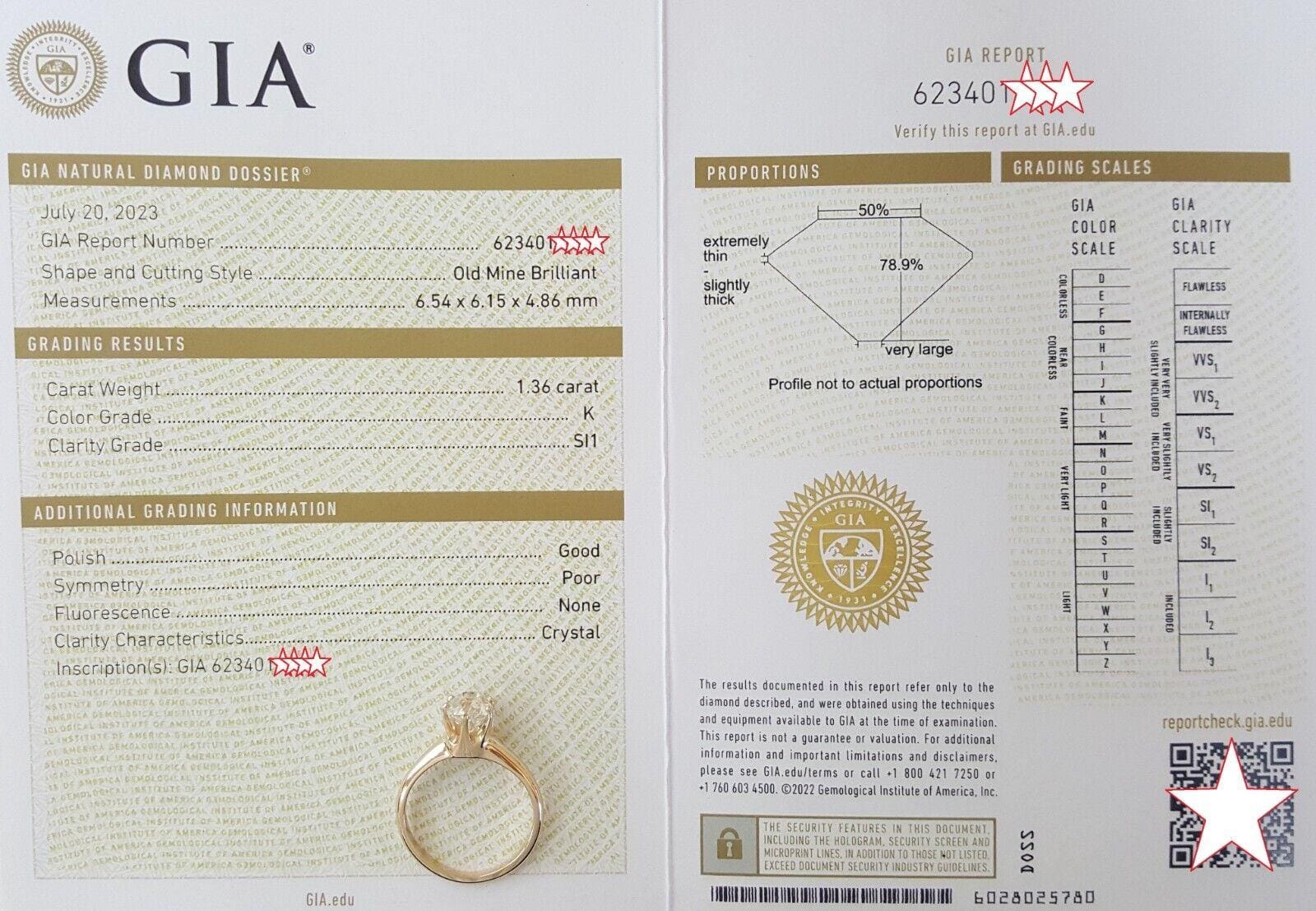 You are purchasing a 1.36 ct total weight Antique / Victorian / Art Deco Old Mine Cut Diamond Solitaire Engagement Ring 14K Rose Gold. The ring weighs 3 grams, size 6.25, the center stone is a Natural Old Mine Cut diamond weighing 1.36 ct, K color, SI1 in clarity. The measurements of the center stone are 6.54 x 6.15 x 4.86 mm. With inscription "GIA 623401****" on the girdle. The diamond was cut in the mid 1800's. The ring is stamped "14K". The ring comes with GIA Report #GIA 623401****.