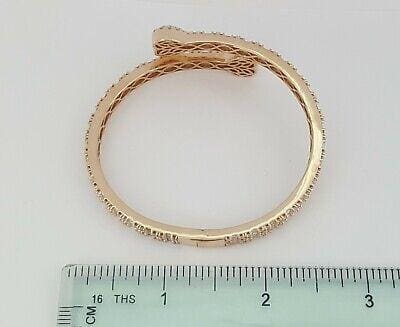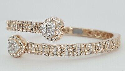 You are purchasing a 4.69 ct total weight 14K Rose Gold Round Brilliant & Baguette Cut Diamond Heart Bangle / Bracelet. The bracelet weighs 22.2 grams, 6.75 inches in length, contains 247 Natural Baguette & 196 Natural Round Brilliant Cut Diamonds weighing approximately 4.7 ct, F-H in color, the baguette diamonds are VS1-SI2 clarity, the round diamonds are SI2-I1 clarity. The width of the bracelet is 5.4 mm & the thickness is 3.8 mm.