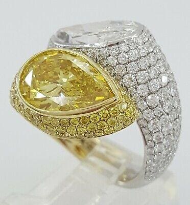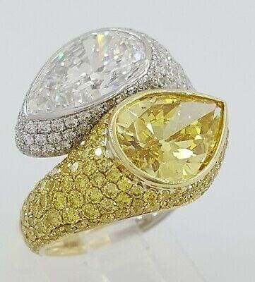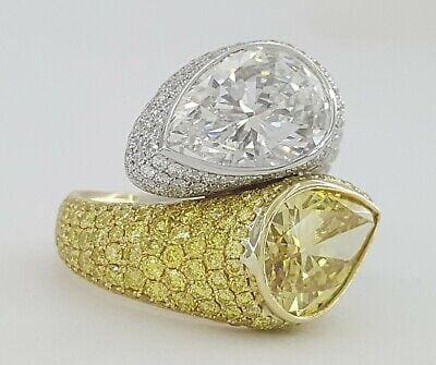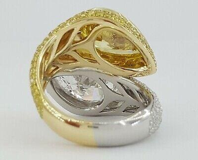 You are purchasing a 10.38 ct total weight Platinum & 18K Yellow Gold Bypass Pear Brilliant Cut Natural Fancy Vivid Yellow & E Color Handmade Ring.