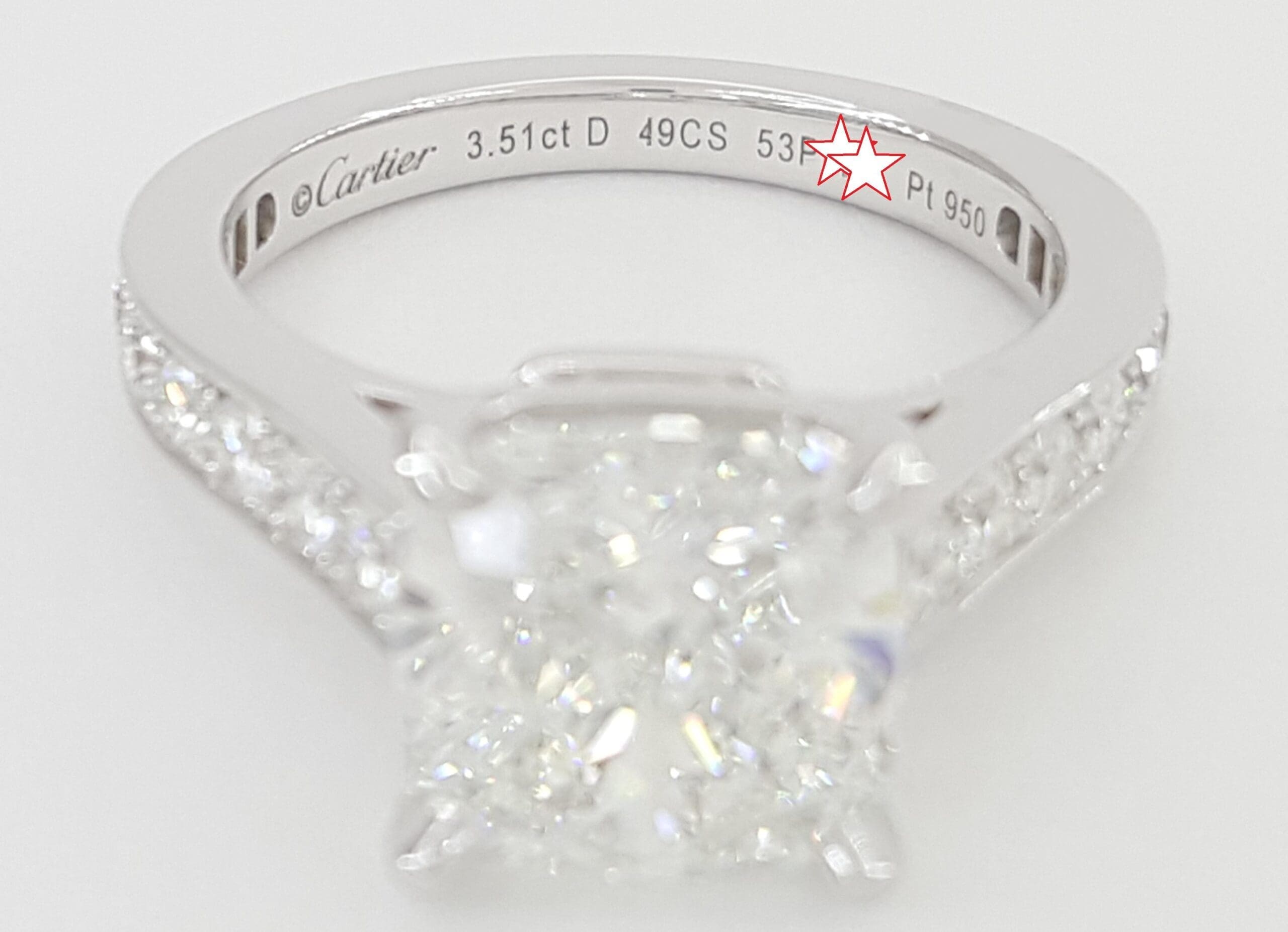 The ring is stamped "©Cartier Pt 950" & "49CS 3.51ct D 53P***".