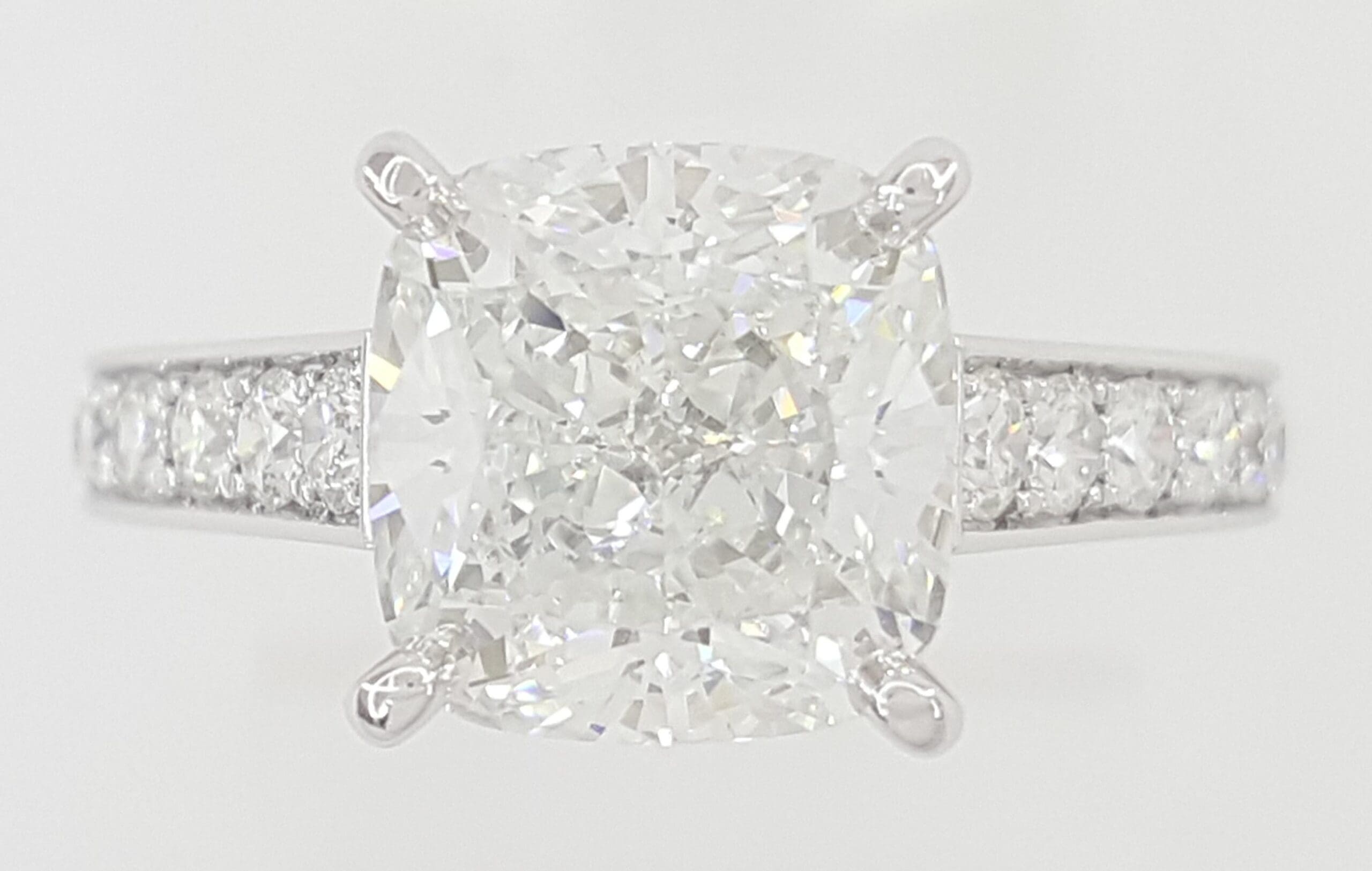 The ring weighs 6.2 grams, size 4.75 (French 49), the center stone is a 3.51 ct Natural Cushion Brilliant Cut diamond, F in color, VS2 in clarity, Excellent Polish, Excellent Symmetry, & None fluorescence. Graded by GIA w/ Report # 119382***.