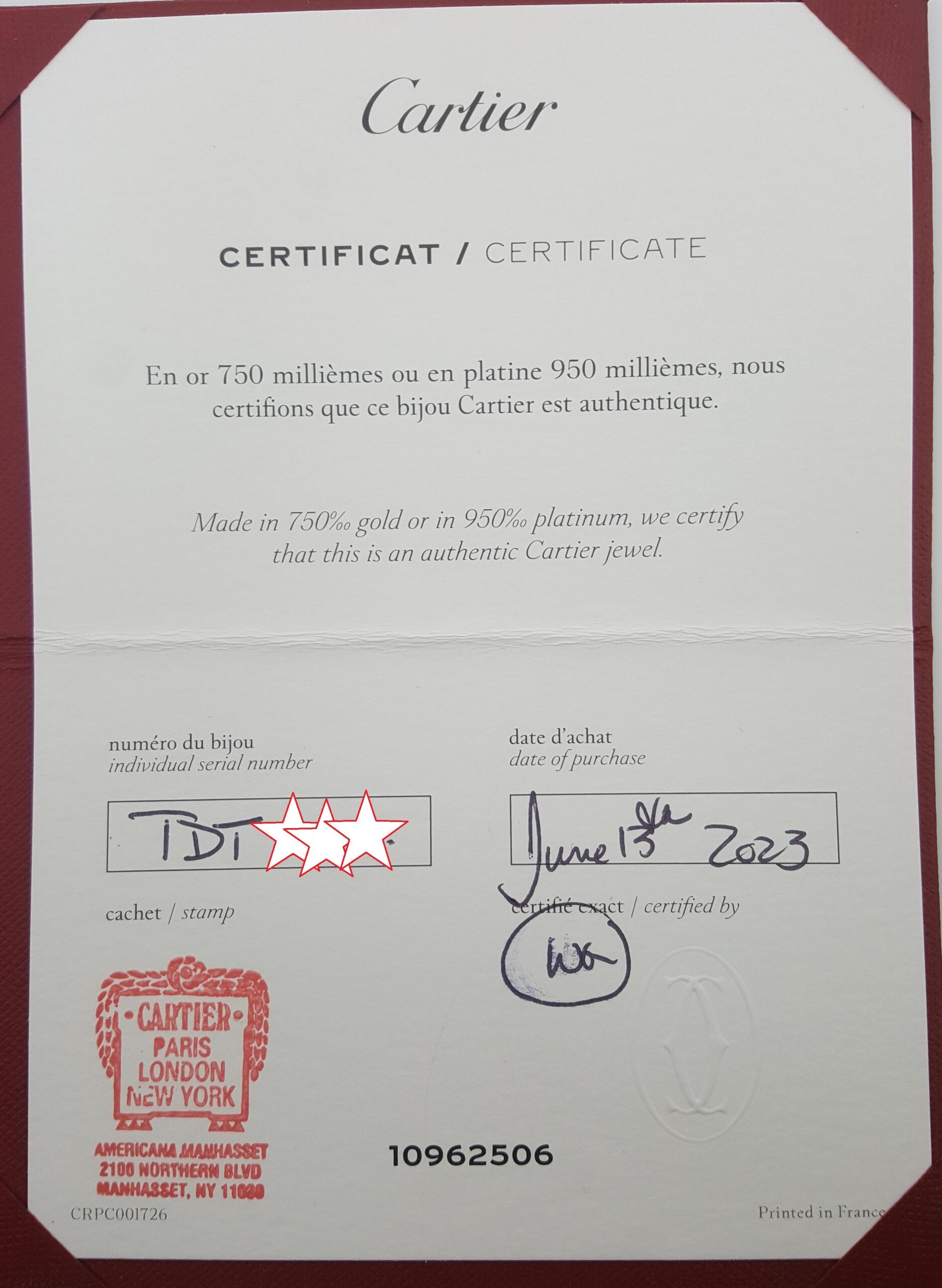 In Excellent Condition, Sold New in 2023, Comes with Cartier Certificate of Authenticity. We don't have the box.