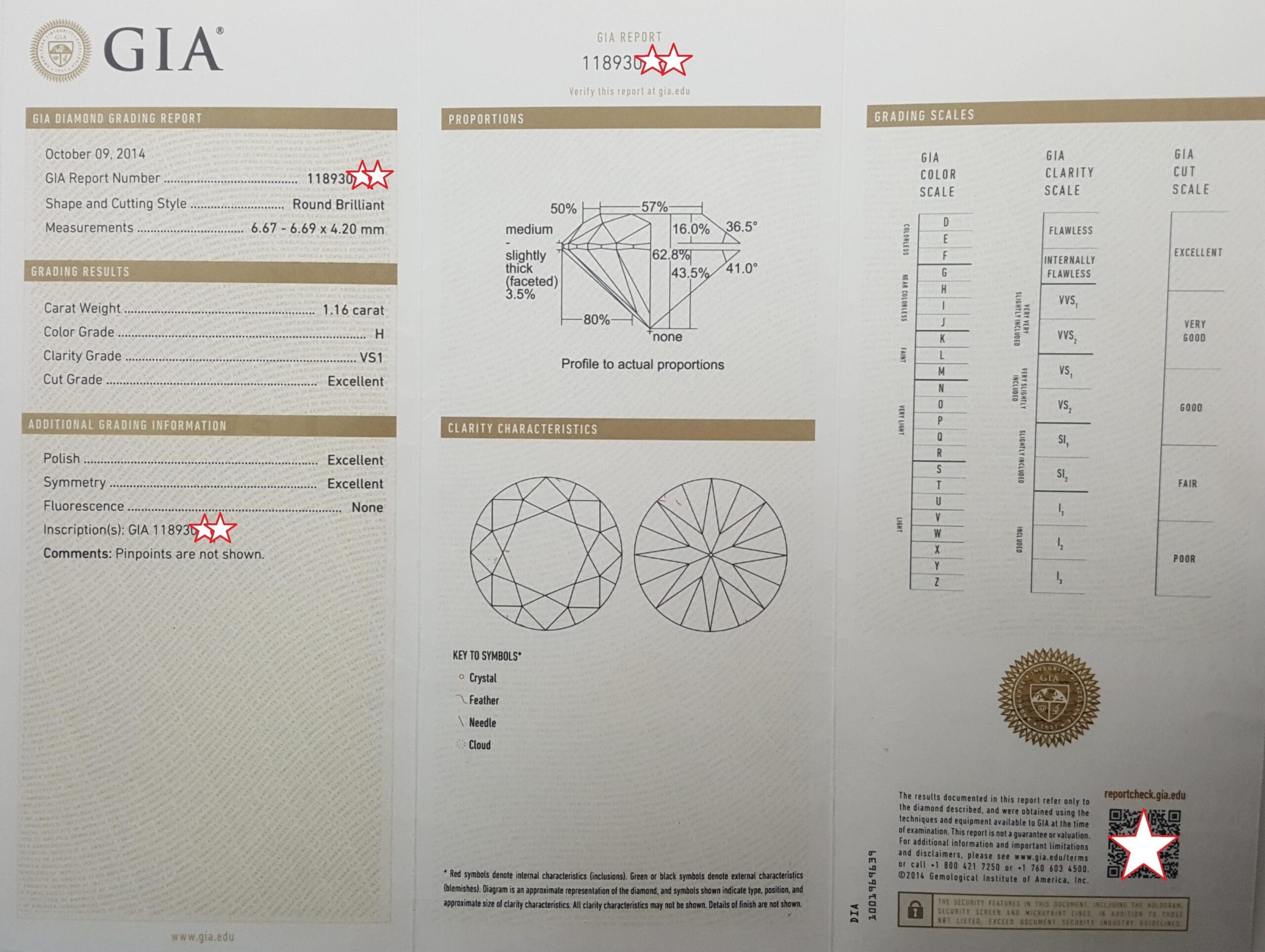 The ring weighs 7.7 grams, size 46 (US Size 3.75) (can resized to most fingers), the center stone is a Natural 1.16 ct Round Brilliant Cut Diamond, H in color, VS1 in clarity, Excellent Cut, Excellent Polish, Excellent Symmetry, None Fluorescence, measuring 6.67 x 6.69 x 4.20 mm, Inscribed "GIA 118930****".