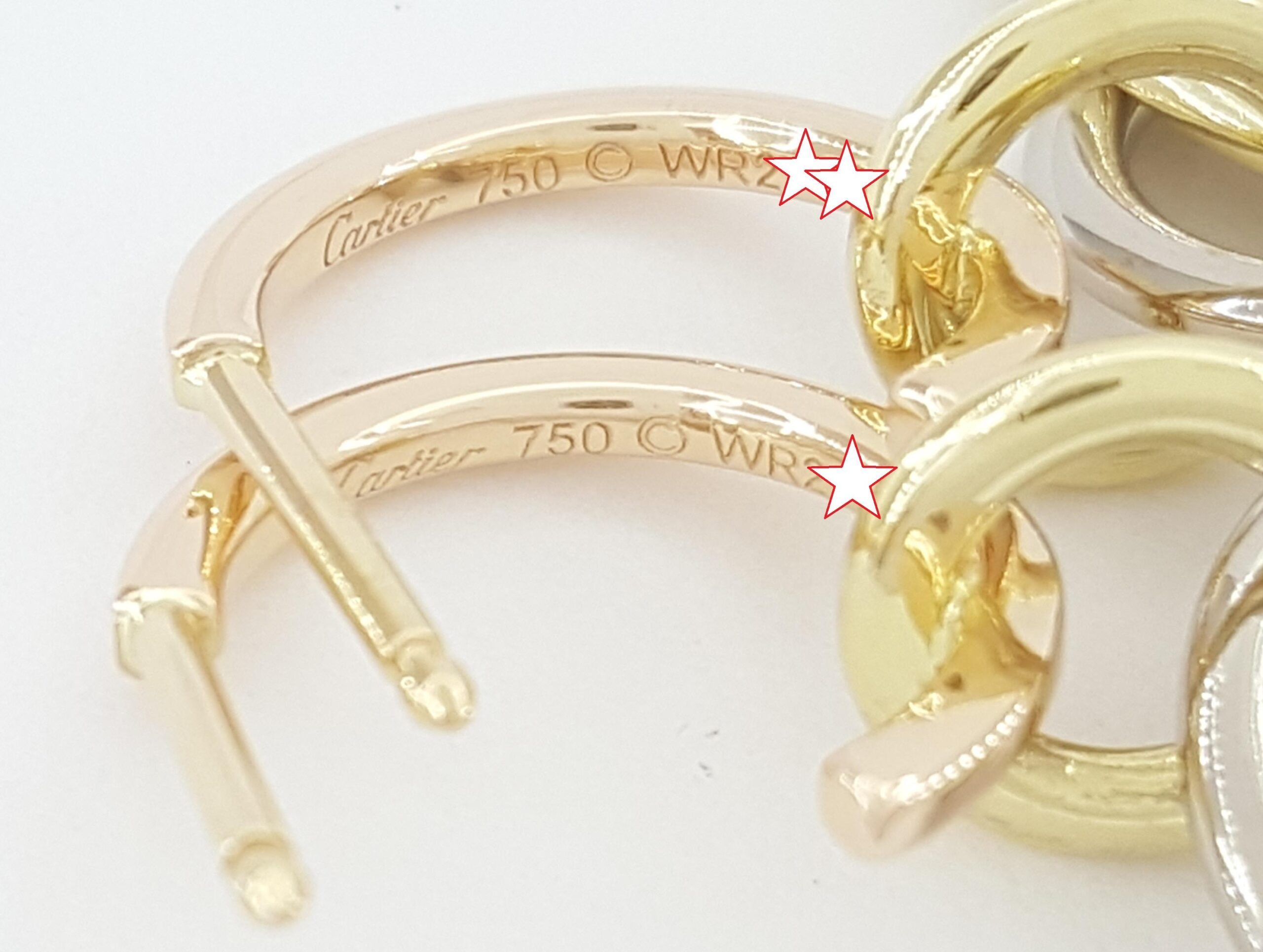 The earrings weigh 16.5 grams of solid 18K Yellow, White & Rose Gold, 20 mm wide, 43.8 mm long (1.72"), there are natural round brilliant cut diamonds weighing ~0.55 ct total weight, D-F in color, VVS-VS in clarity, stamped "© Cartier 750 WR2***"