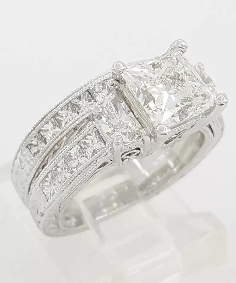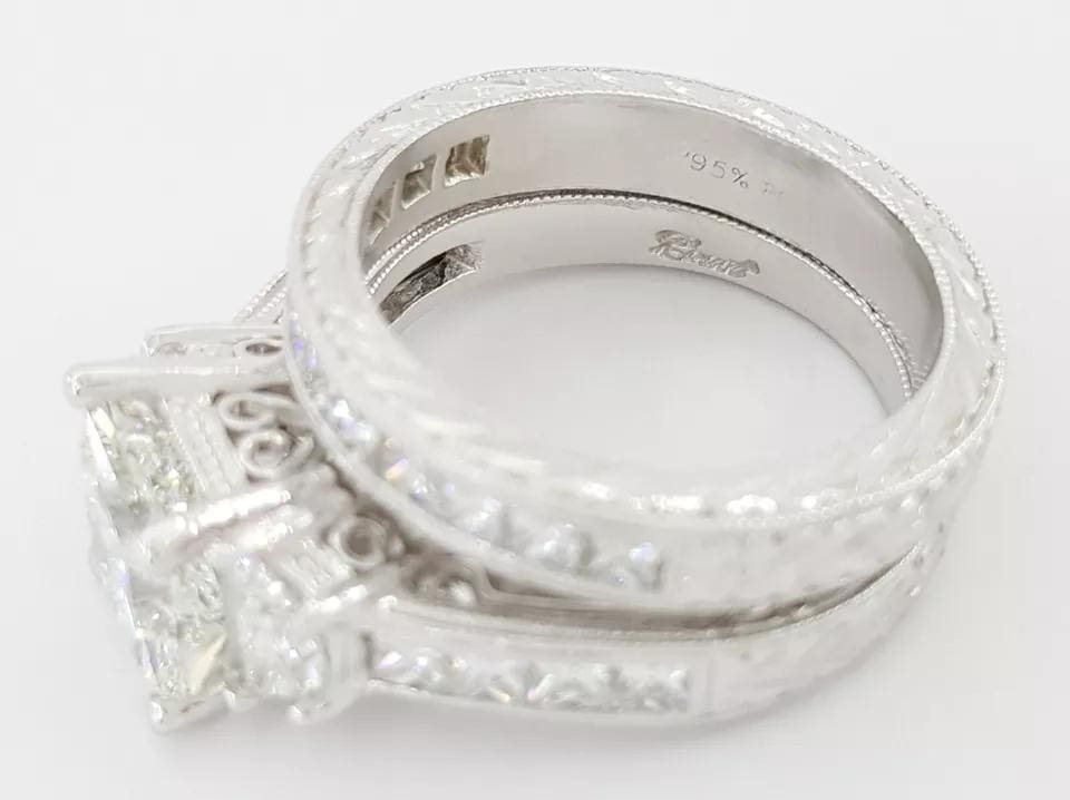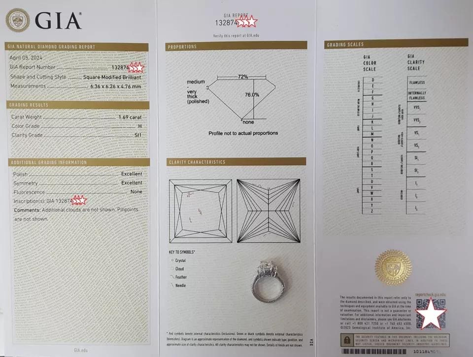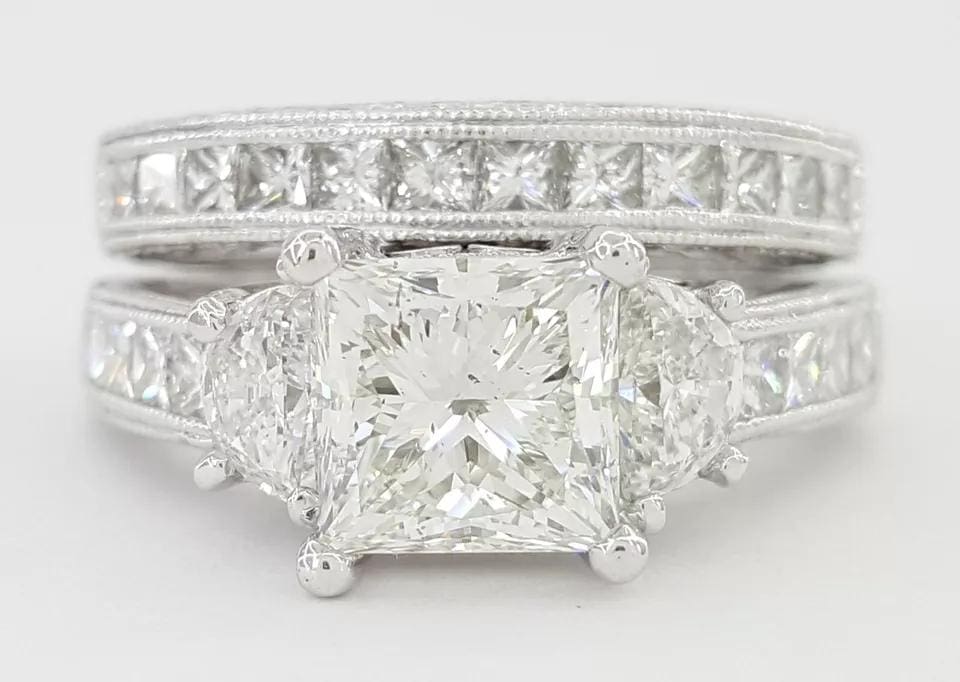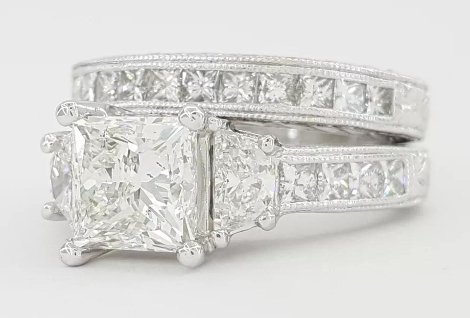 The rings weigh 13.6 grams total, size 4.5, with a 1.69 ct Natural Princess Cut center diamond, H in color, SI1 in clarity with Excellent polish, Excellent symmetry, No fluorescence, measuring 6.36 x 6.26 x 4.76 mm, & Girdle inscribed "GIA 132874****"