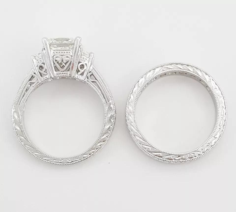 There are 2 Half Moon Cut Natural side diamonds weighing approximately 0.44 ct, F-H in color, VS-SI in clarity & 20 Natural Princess Brilliant Cut diamonds weighing approximately 0.7 ct, F-H in Color, VS-SI in Clarity. Both rings were hand-engraved.