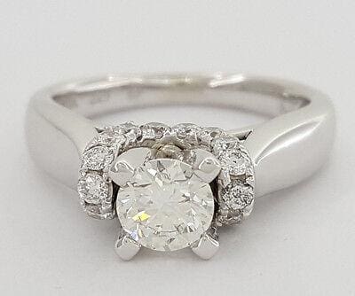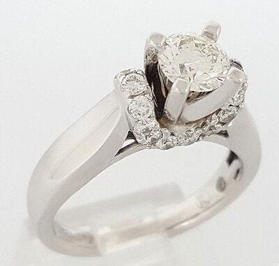 The ring weighs 5 grams, size 6, the center stone is a Natural Round Brilliant Cut diamond weighing 0.60 ct, F-G in color, SI1 in clarity. There are 18 Round Brilliant Cut side diamonds weighing 0.40 ct, F-G in color, VS2-SI2 in clarity.