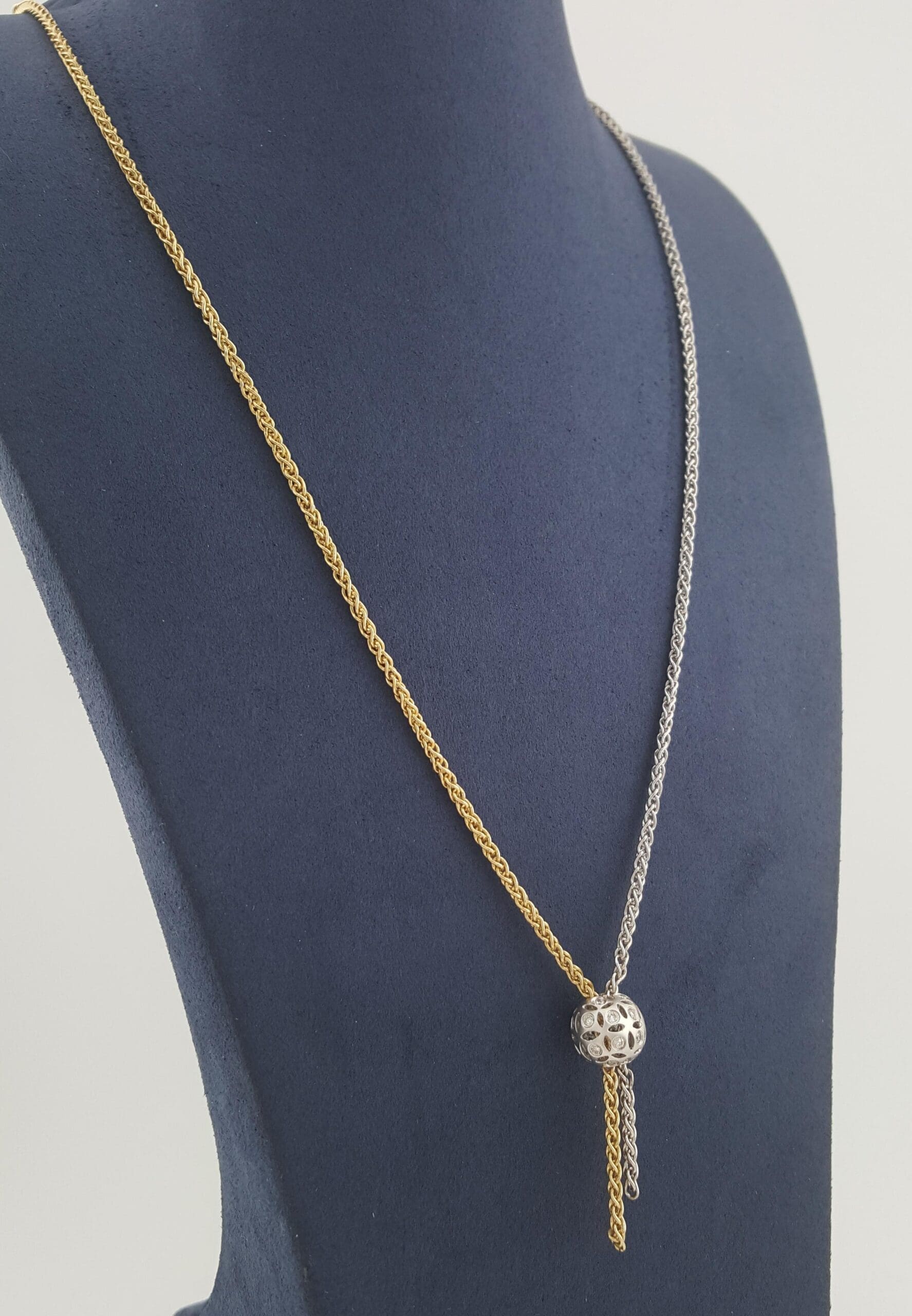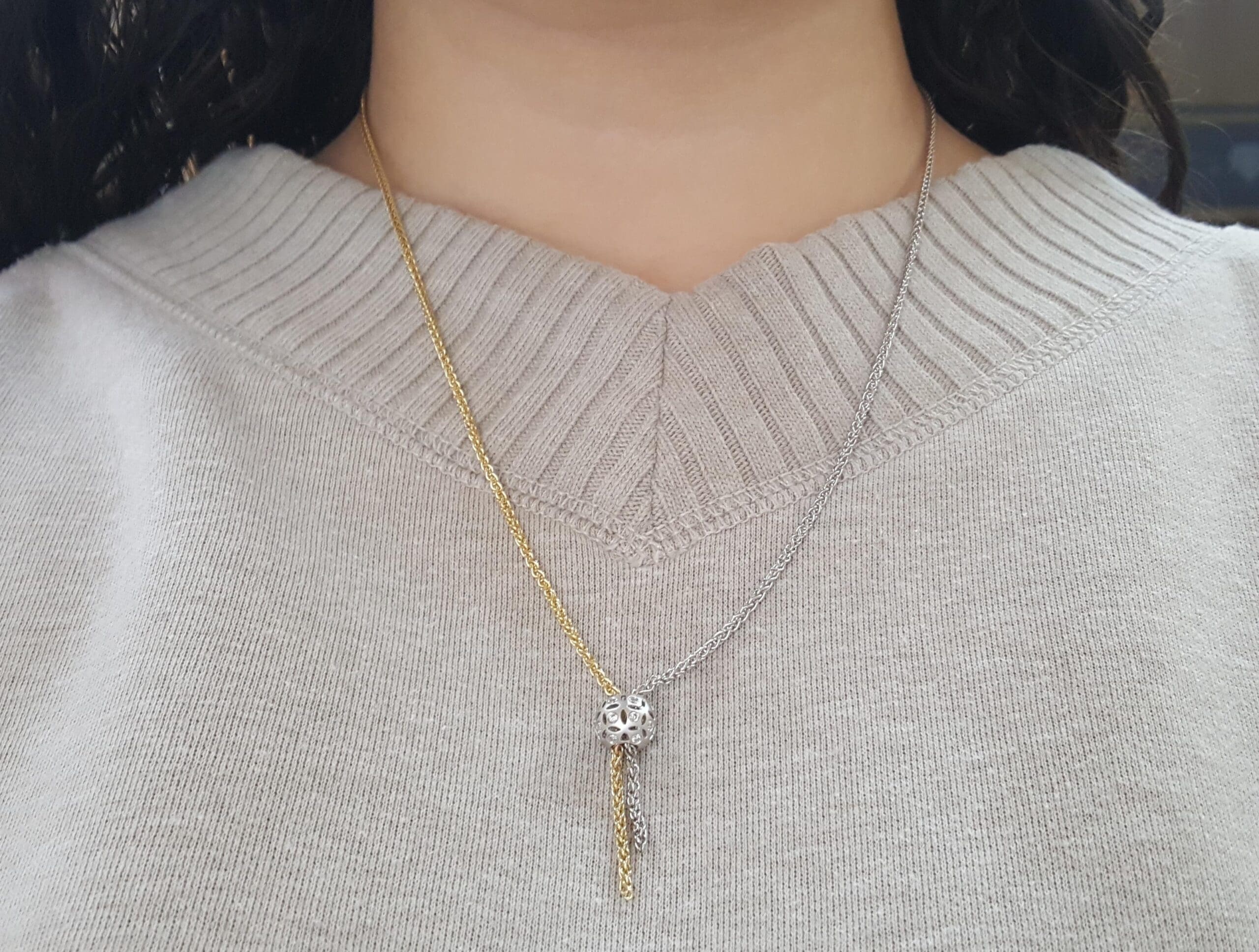 The necklace weighs 9.2 grams, the sphere is 9.3 mm in diameter, there are 24 Natural Round Brilliant Cut Diamonds weighing ~0.36 ct, I-K in color, I1 in clarity.