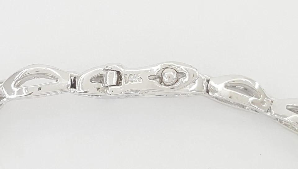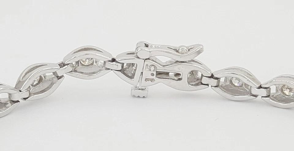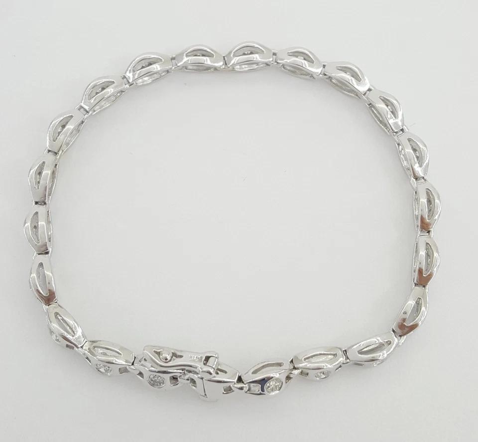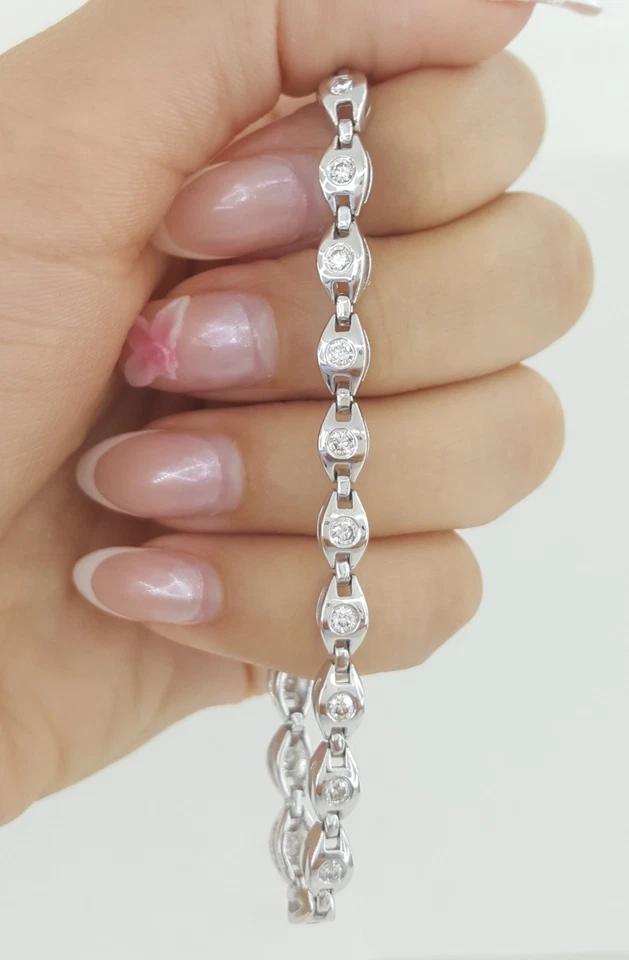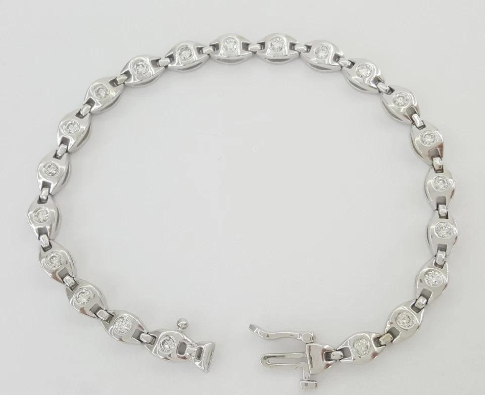 The bracelet weighs 13 grams, 7 inches long, there are 21 Natural Round Brilliant Cut diamonds weighing approximately 1.5 ct total weight, F-H in color, SI-I1 in clarity, 4.8 mm wide, 3.5 mm thick. The clasp is stamped "14k 1.5".