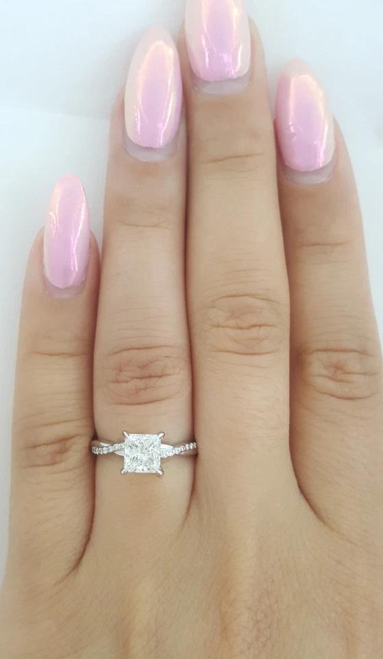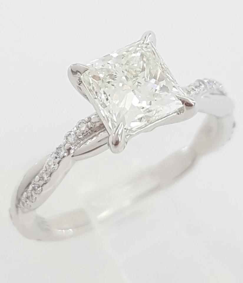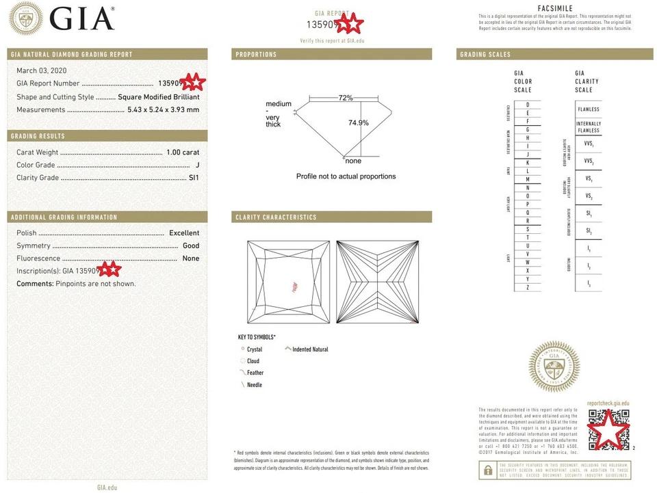 The ring weighs 2.3 grams, size 4, with a 1.00 ct Natural Princess Brilliant Cut center diamond, J in color, SI1 in clarity, measuring 5.43 x 5.24 x 3.93 mm, Excellent Polish, Good Symmetry, None Fluorescence w/ GIA Inscription # 135909****.