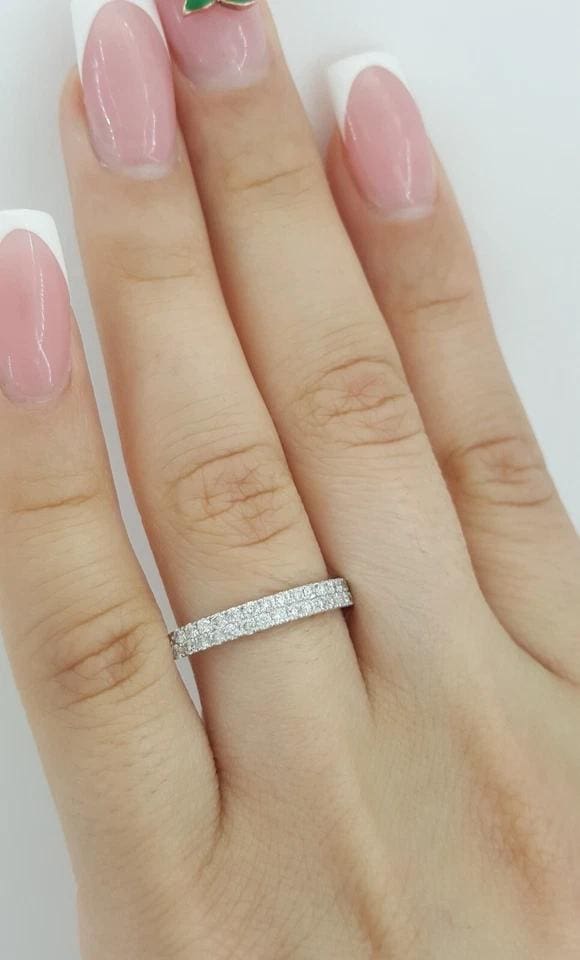 The ring weighs 2.1 grams, size 8.75, 3 mm wide, there are 33 Natural Round Brilliant Cut Diamonds weighing ~0.5 ct total weight, G-H in color, SI-I1