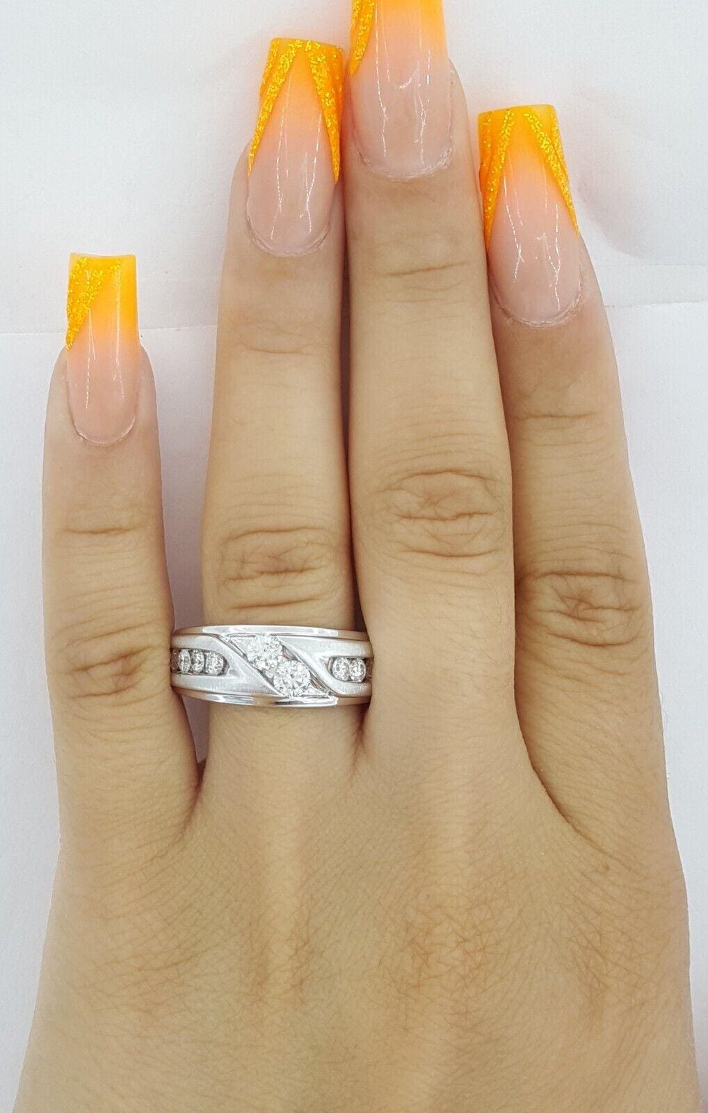 The ring weighs 9.8 grams, size 9, there are 14 Natural Round Brilliant Cut diamonds weighing approximately 1 ct total weight, G-I in color, SI1-I1 in clarity.