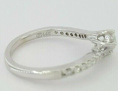 The ring weighs 2.9 grams, size 6, there are two Round Brilliant Cut diamonds weighing approximately 0.32 ct, H-I in color, SI2-I1 in clarity & 20 Round Brilliant Cut side diamonds weighing approximately 0.18 ct total weight, H-I in color, SI2-I1 in clarity.