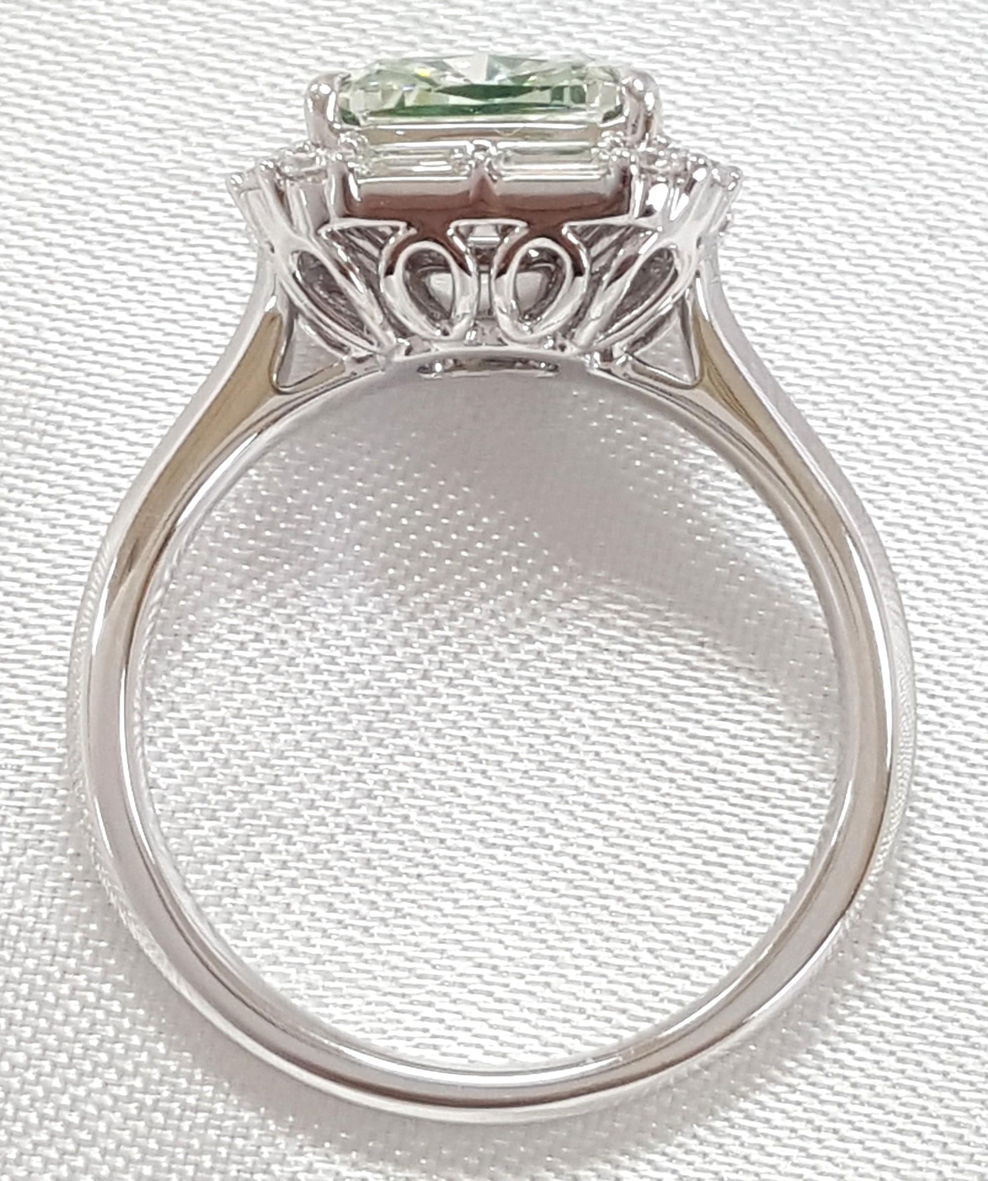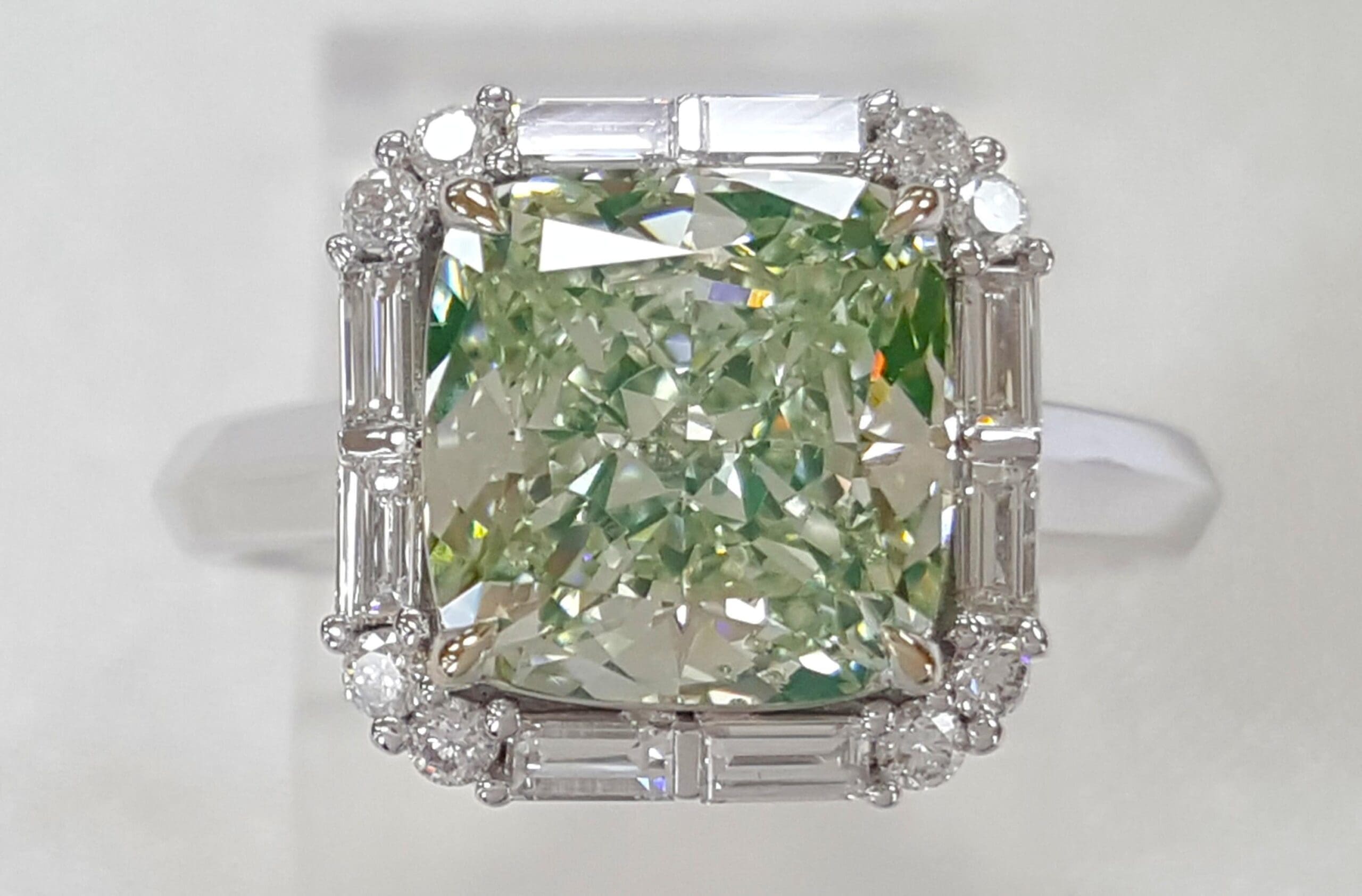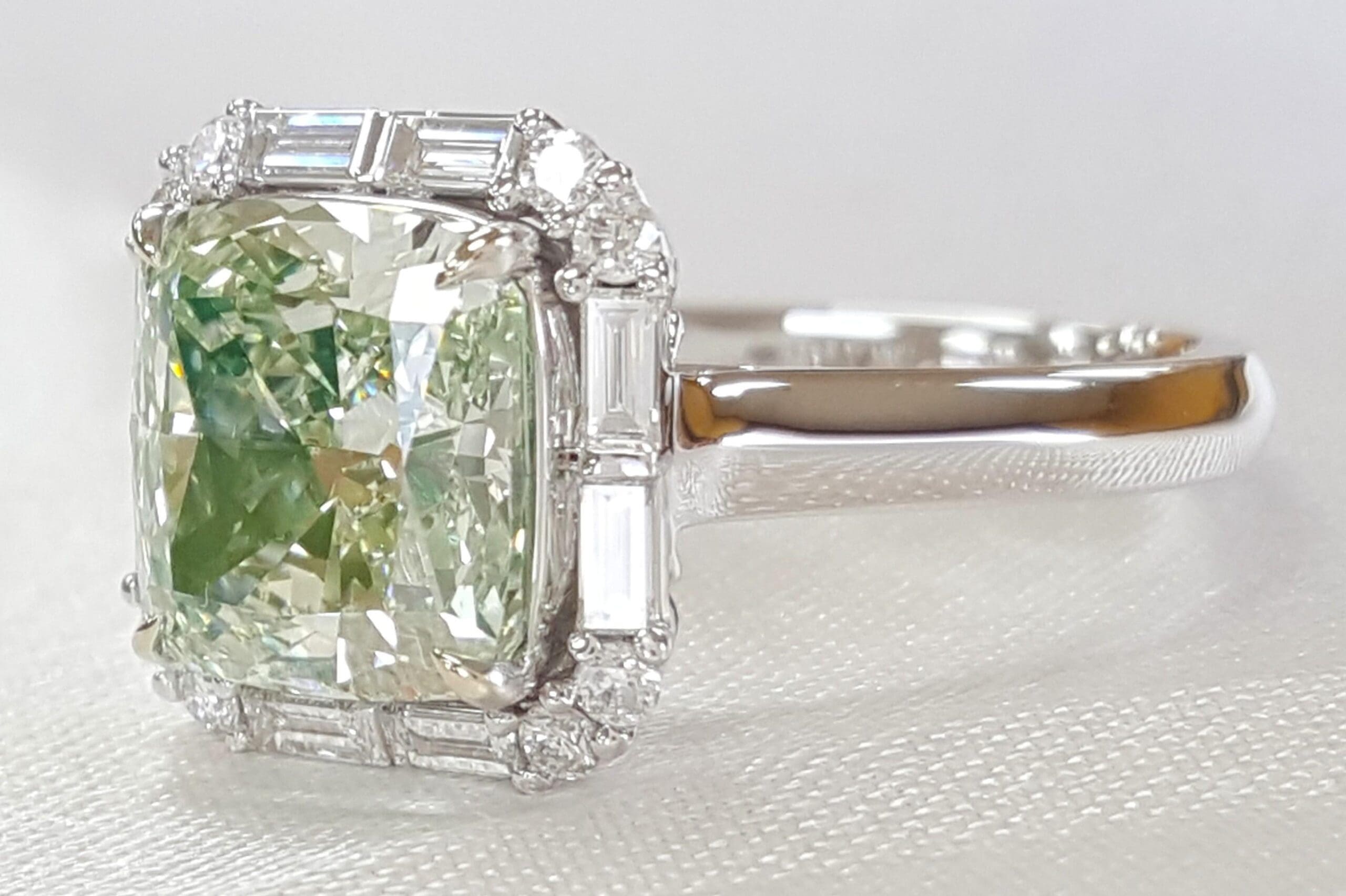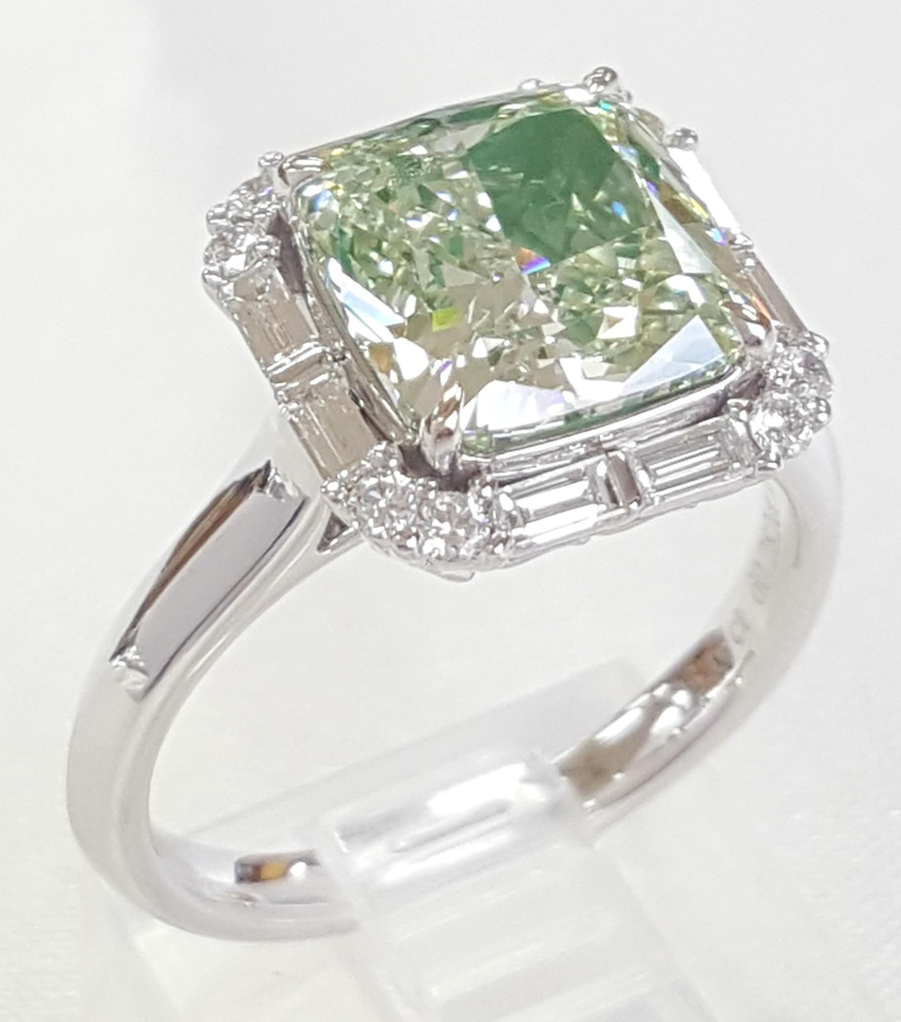 You are purchasing a 3.67 ct Fancy Light Green Cushion Diamond & 0.39 ct Round & Baguette Diamond Halo Engagement Ring in 18k White Gold