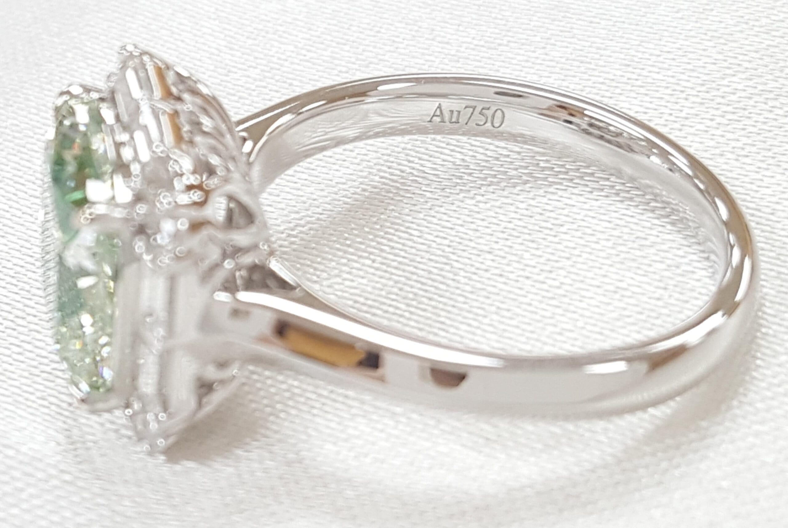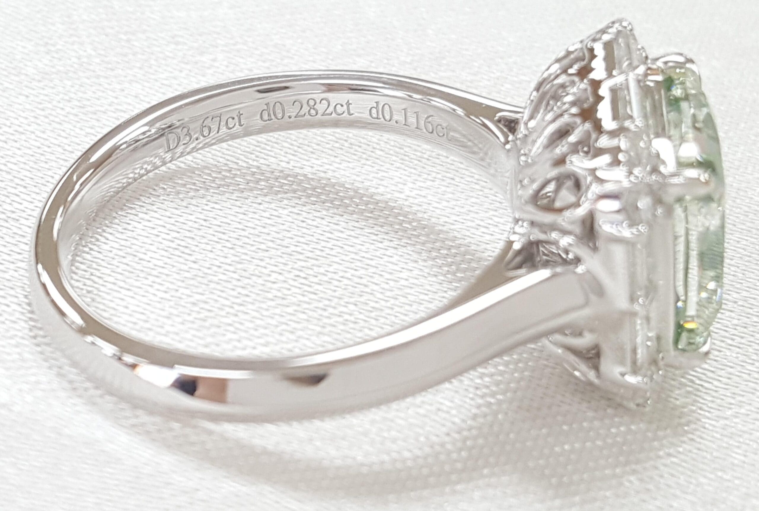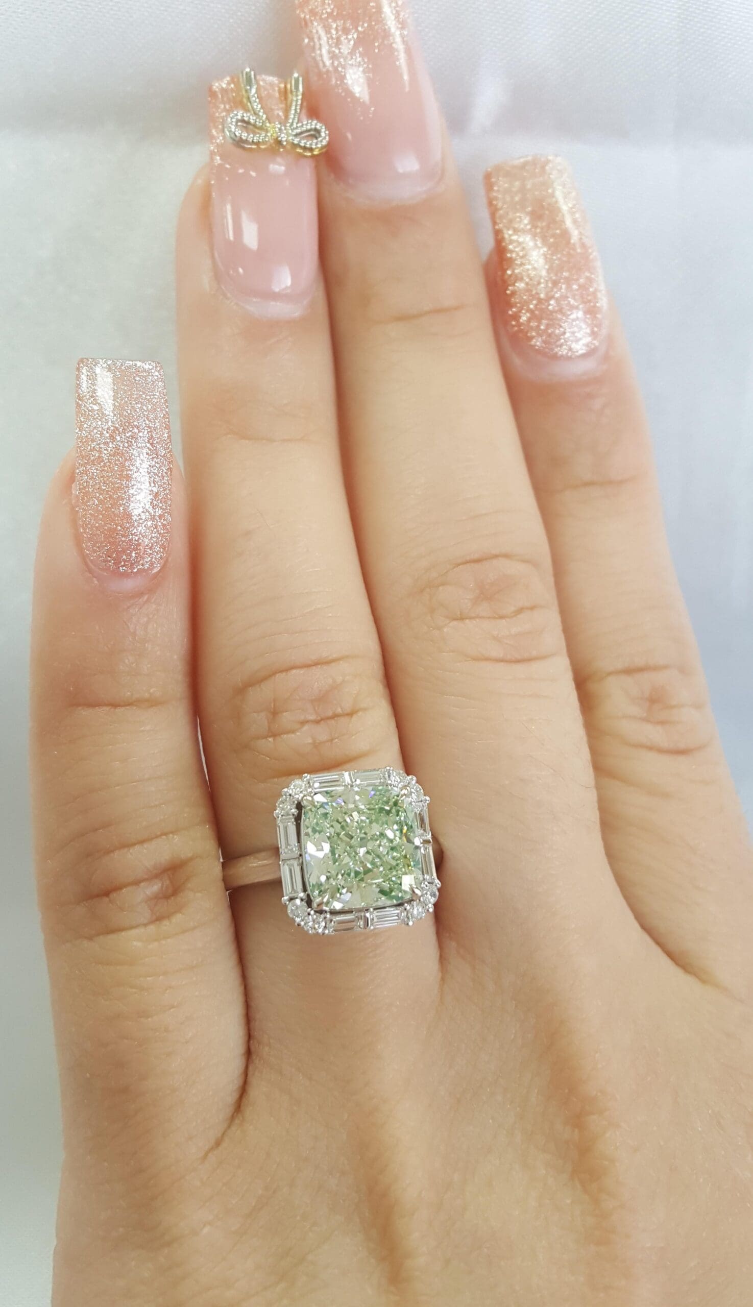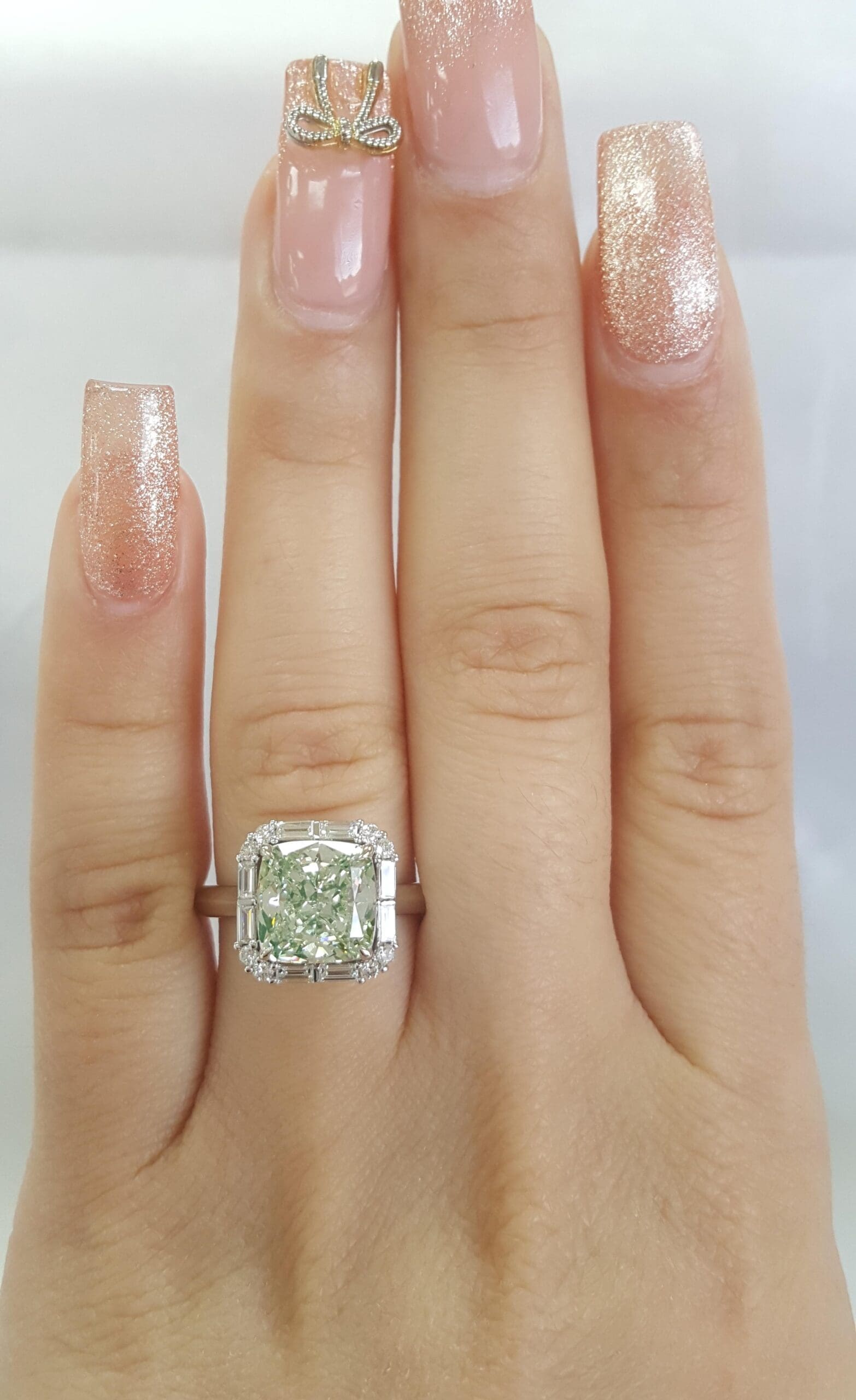 You are purchasing a 3.67 ct Fancy Light Green Cushion Diamond & 0.39 ct Round & Baguette Diamond Halo Engagement Ring in 18k White Gold