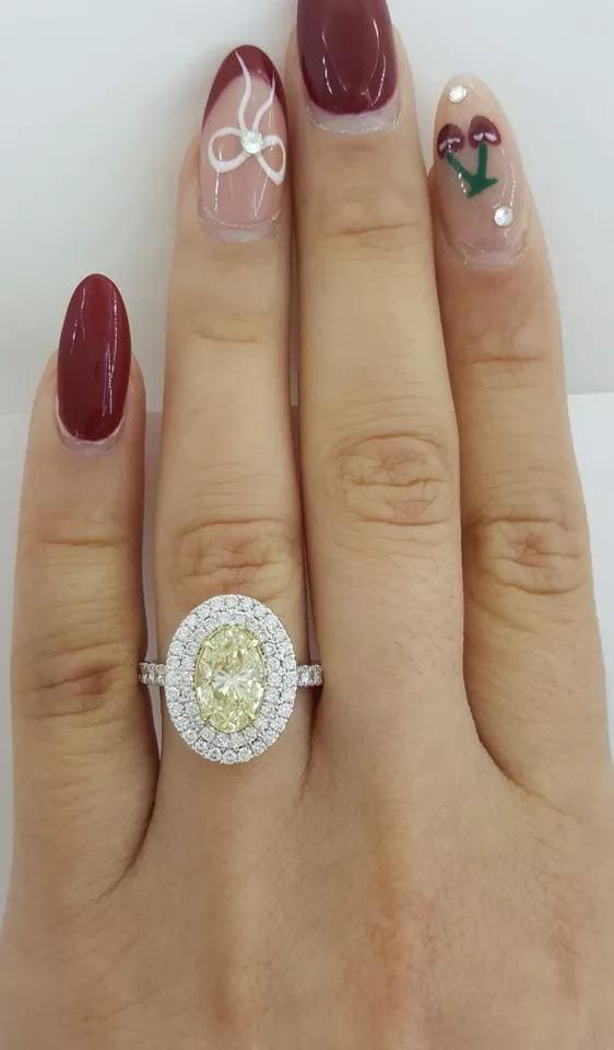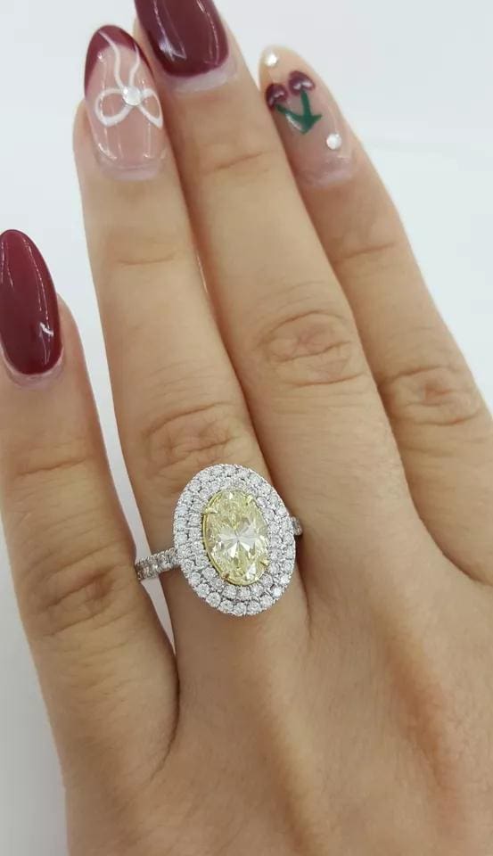 You are purchasing a 2.71 ct total weight Oval Fancy Light Yellow & Round Diamond Double Halo Engagement Ring 14k White Gold.