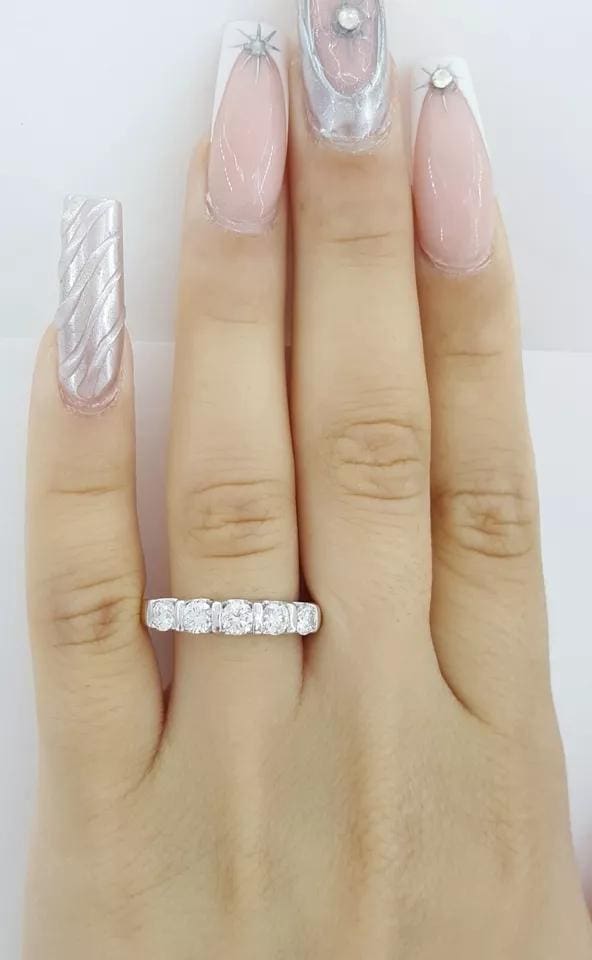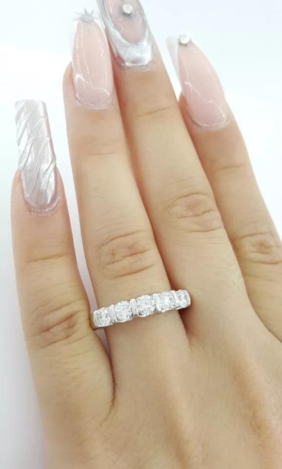 The ring weighs 5.5 grams, size 7, 4 mm wide, 5.1 mm high, there are 5 Natural Round Brilliant Cut diamonds weighing approximately 1 ct total weight, H-J in color, SI1-SI3 in clarity.