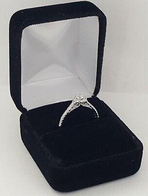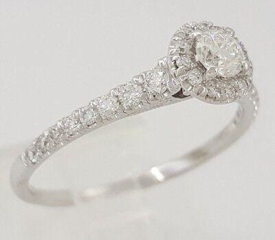 The ring weighs 2.2 grams, size 9, the center stone is a Round Brilliant Cut diamond weighing ~0.25 ct, G-H in color, and SI1 in clarity. There are 28 Round Brilliant Cut side diamonds weighing 0.41 ct total weight, in G-H in color, VS2-SI1 in clarity.