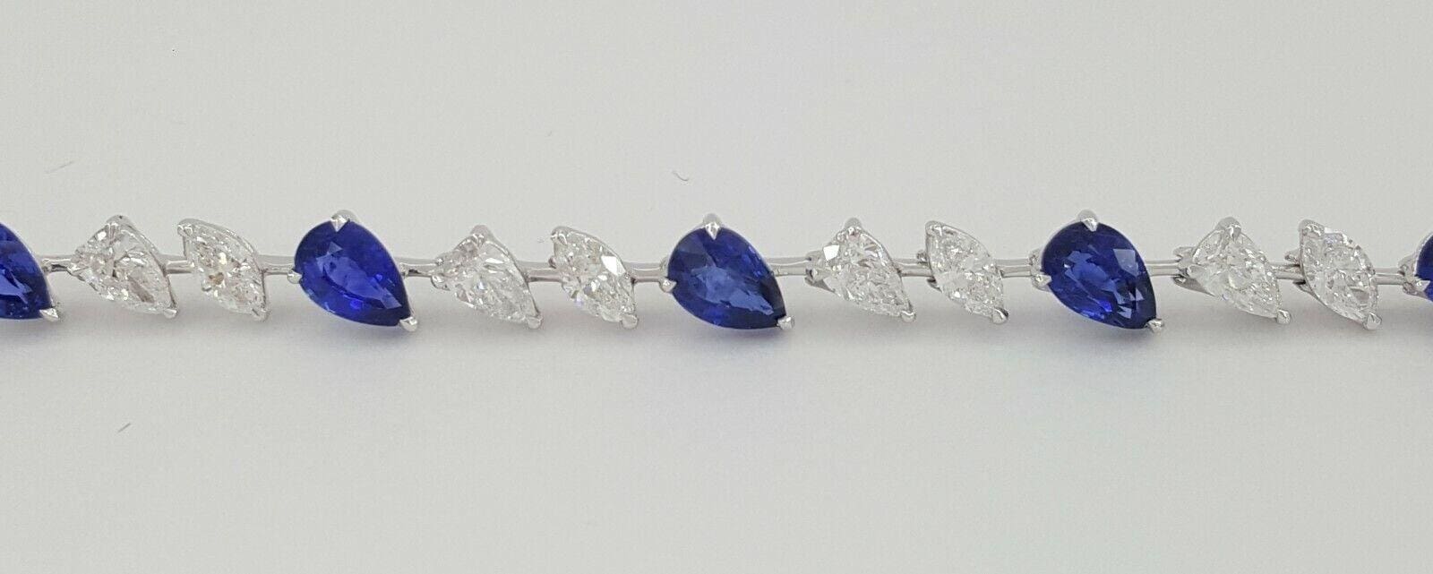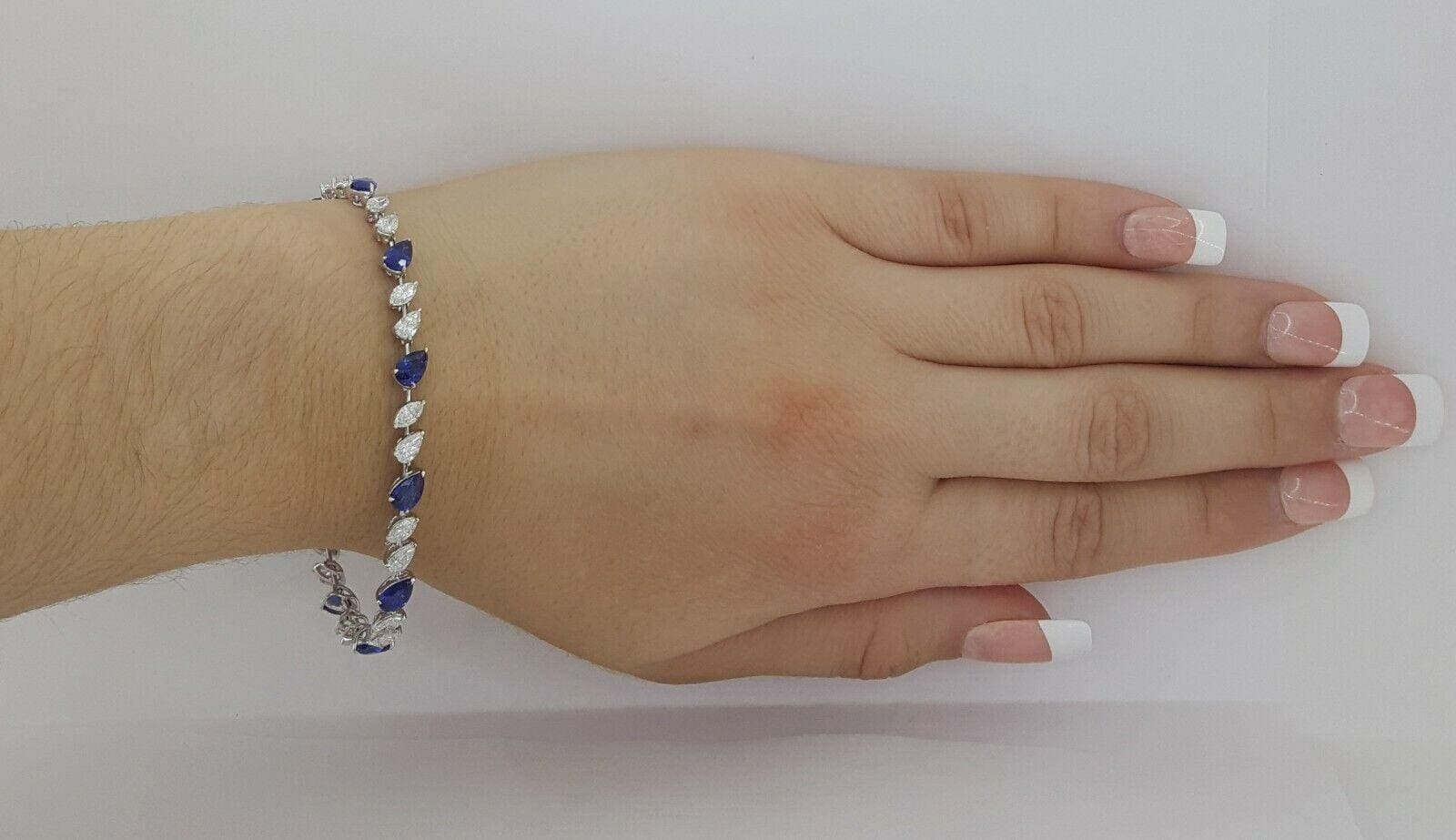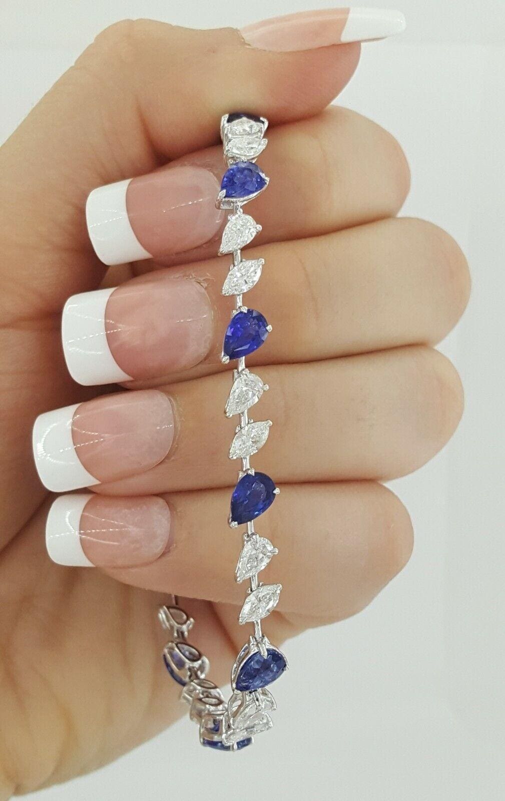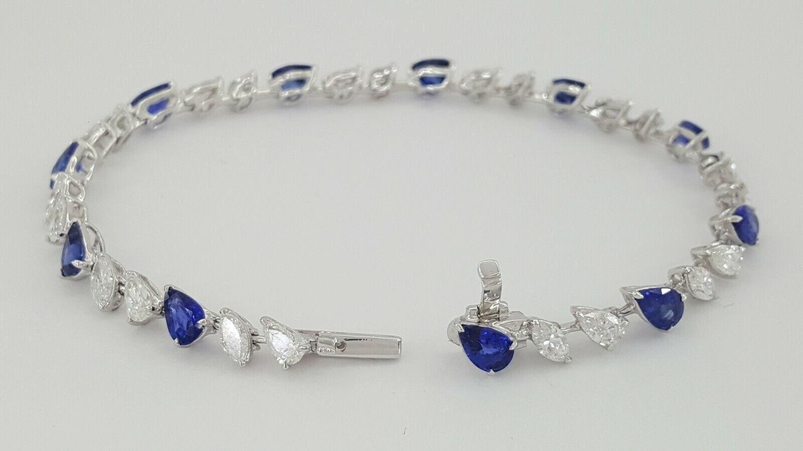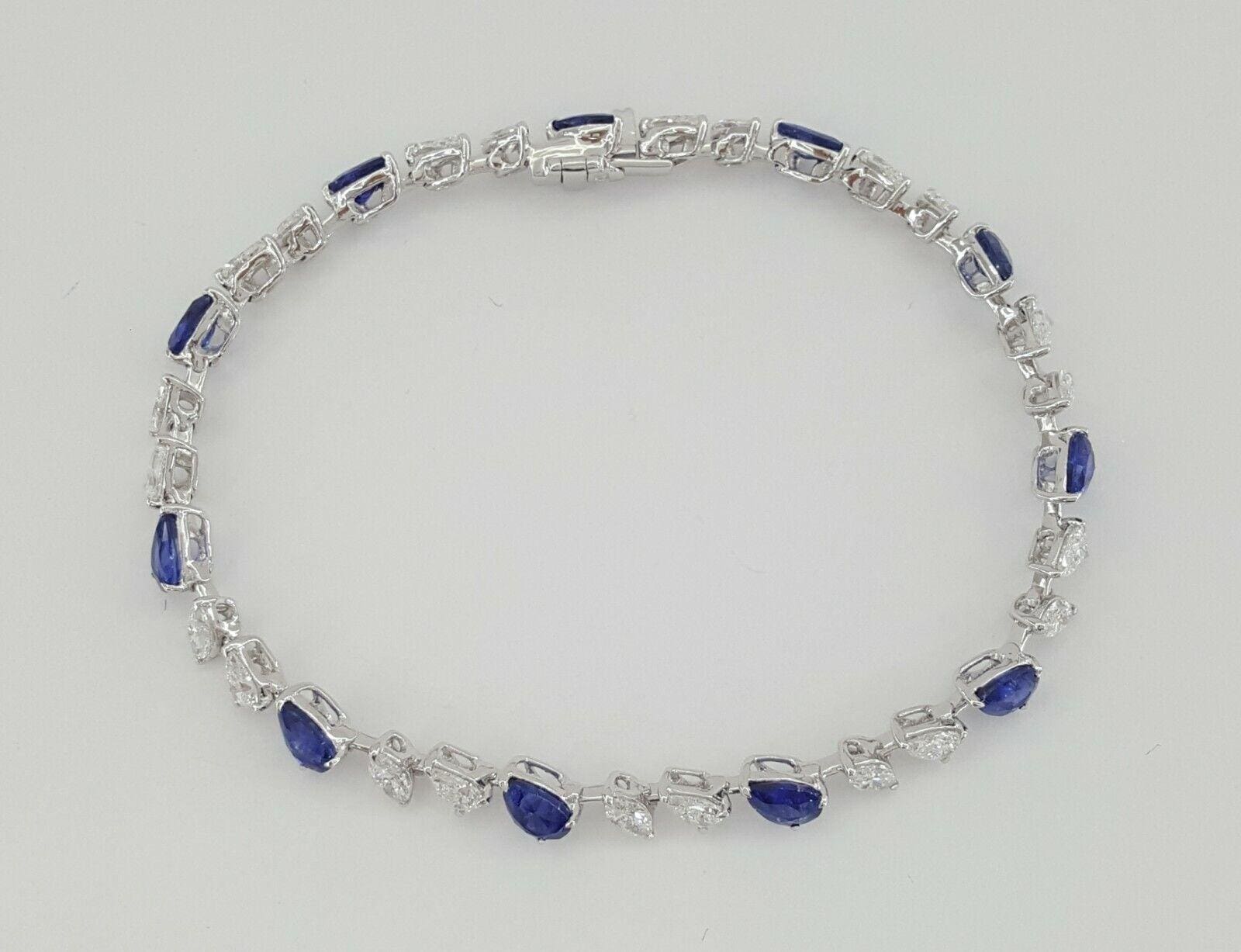 You are purchasing a 9.36 ct total weight 18K White Gold Pear & Marquise Brilliant Cut Diamond & Pear Cut Blue Sapphire Straight Line Tennis Bracelet.