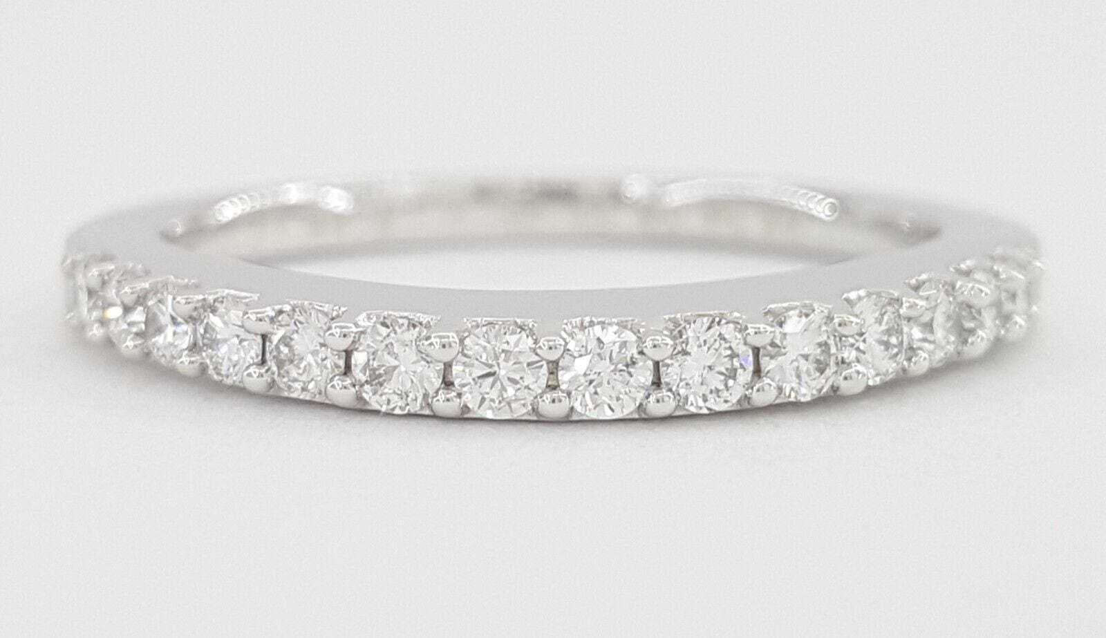 The ring weighs 2.7 grams, size 7, 2.1 mm wide, there are 14 Natural Round Brilliant Cut diamonds weighing approximately 0.35 ct total weight, G-I in color, SI1-SI2 in clarity, are set in shared-prongs settings. The band has a slight curve.