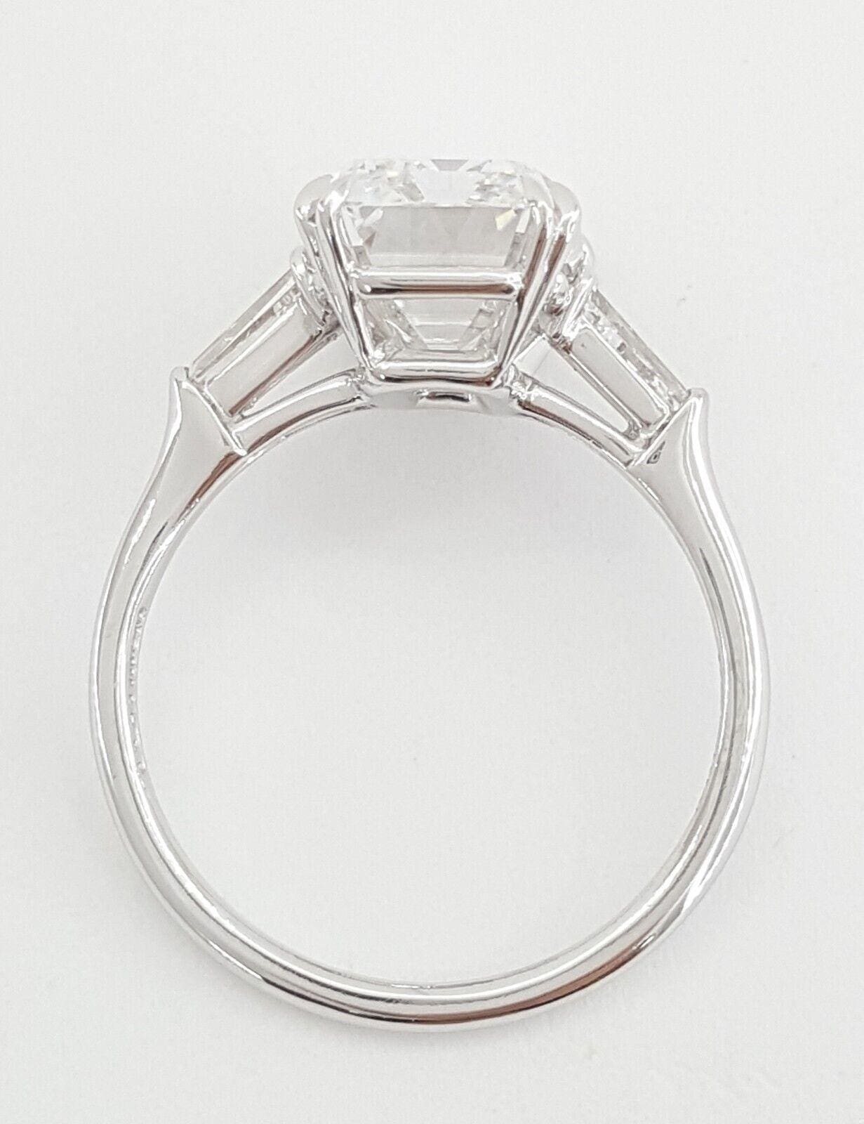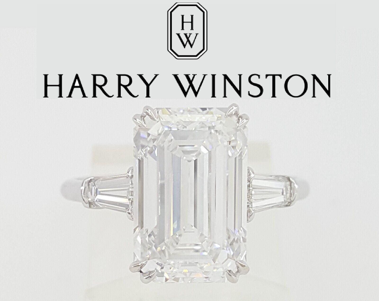 You are buying an authentic Vintage Classic Harry Winston 5.19 ct Total Weight Emerald Cut with Tapered Baguette Diamond Platinum Engagement Ring.