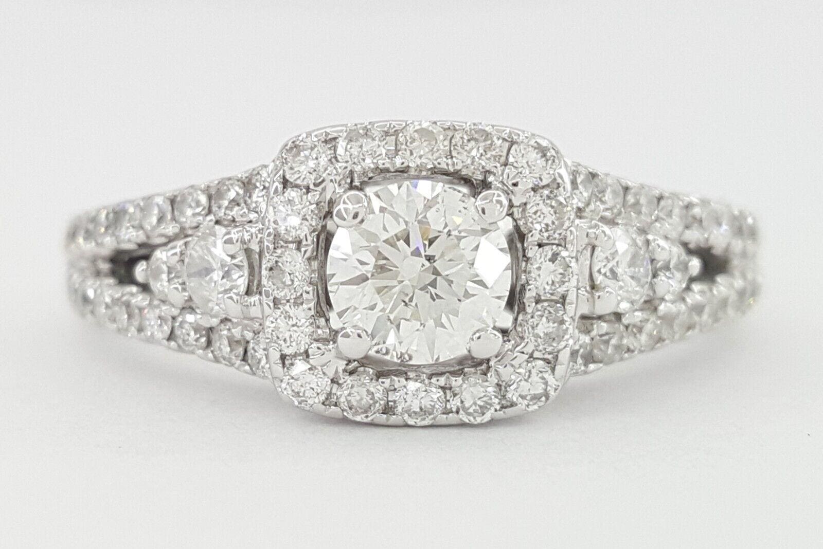 You are Purchasing a Helzberg Signature 1.03 ct Total Weight 14k White Gold Round Brilliant Cut Diamond Halo Engagement Ring.