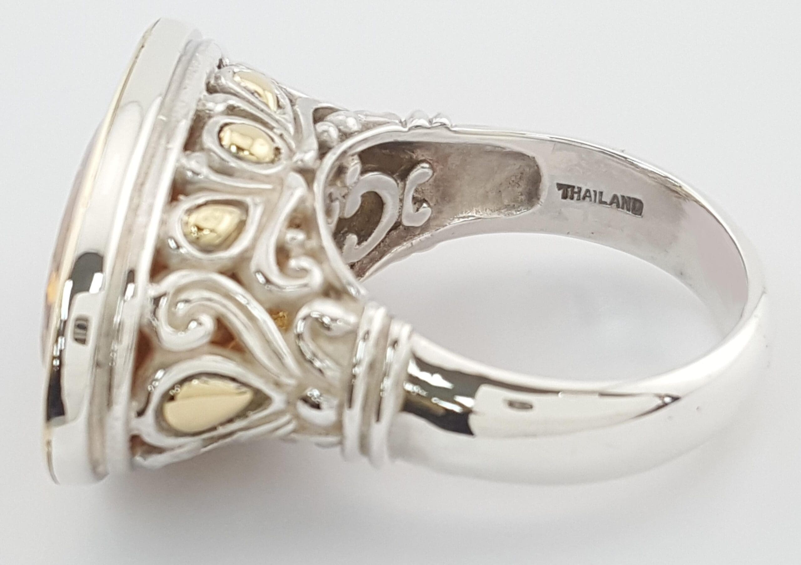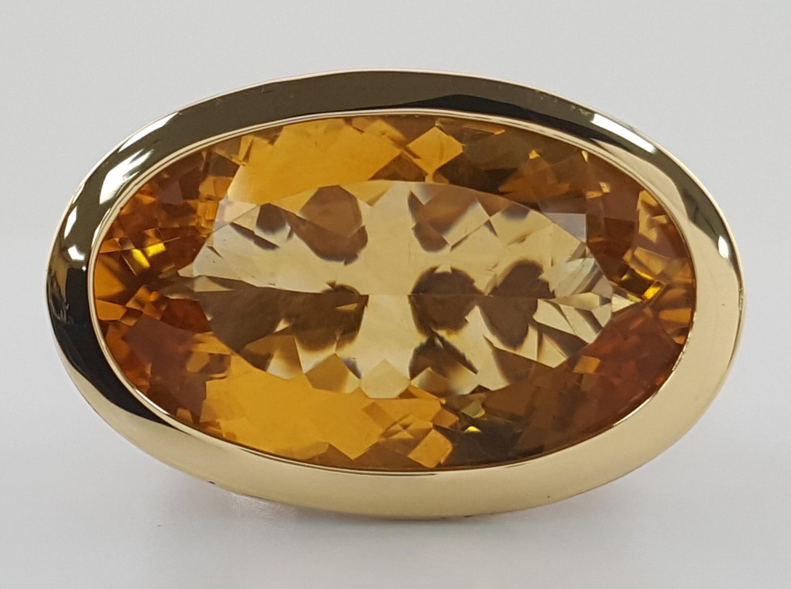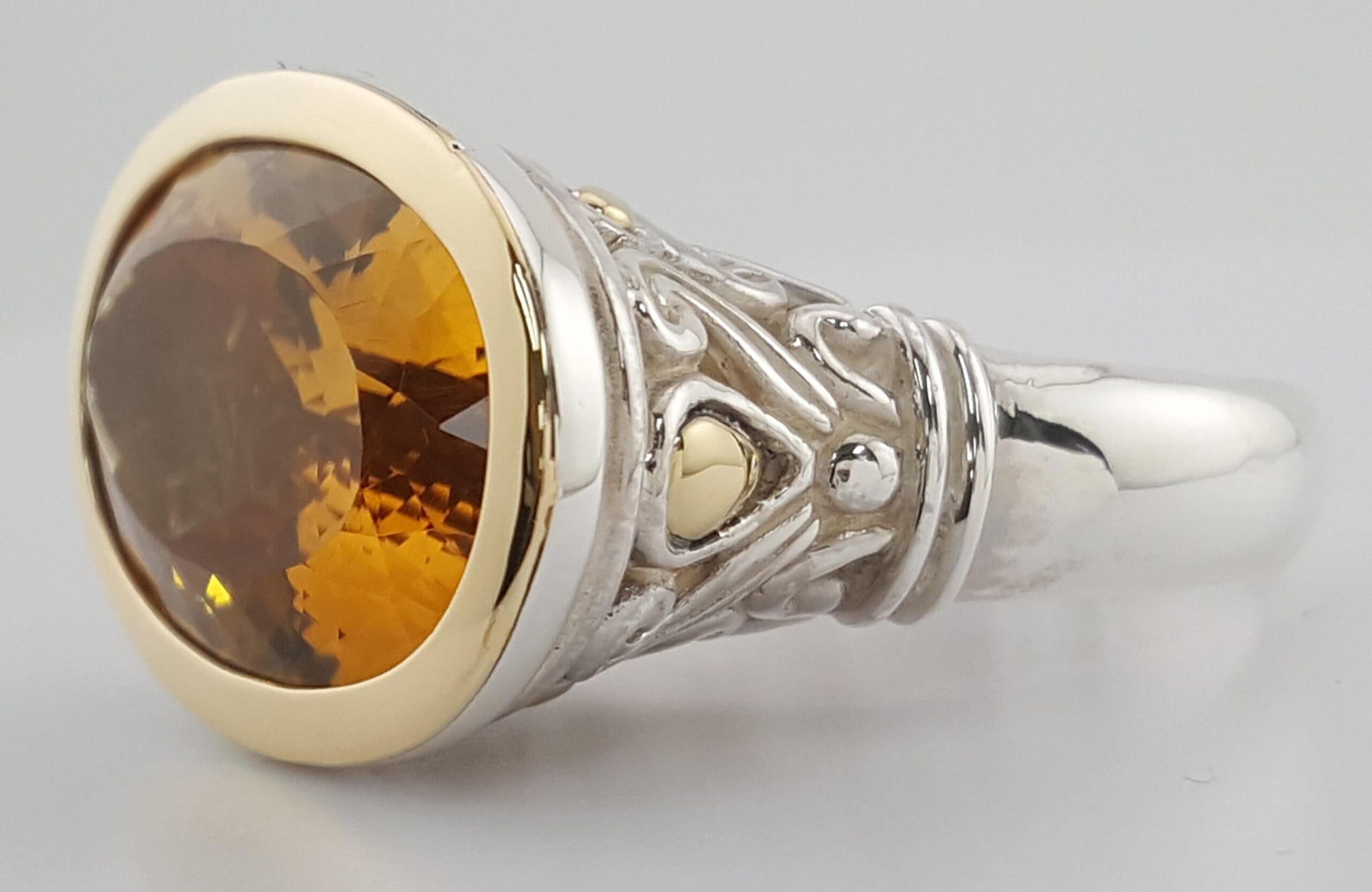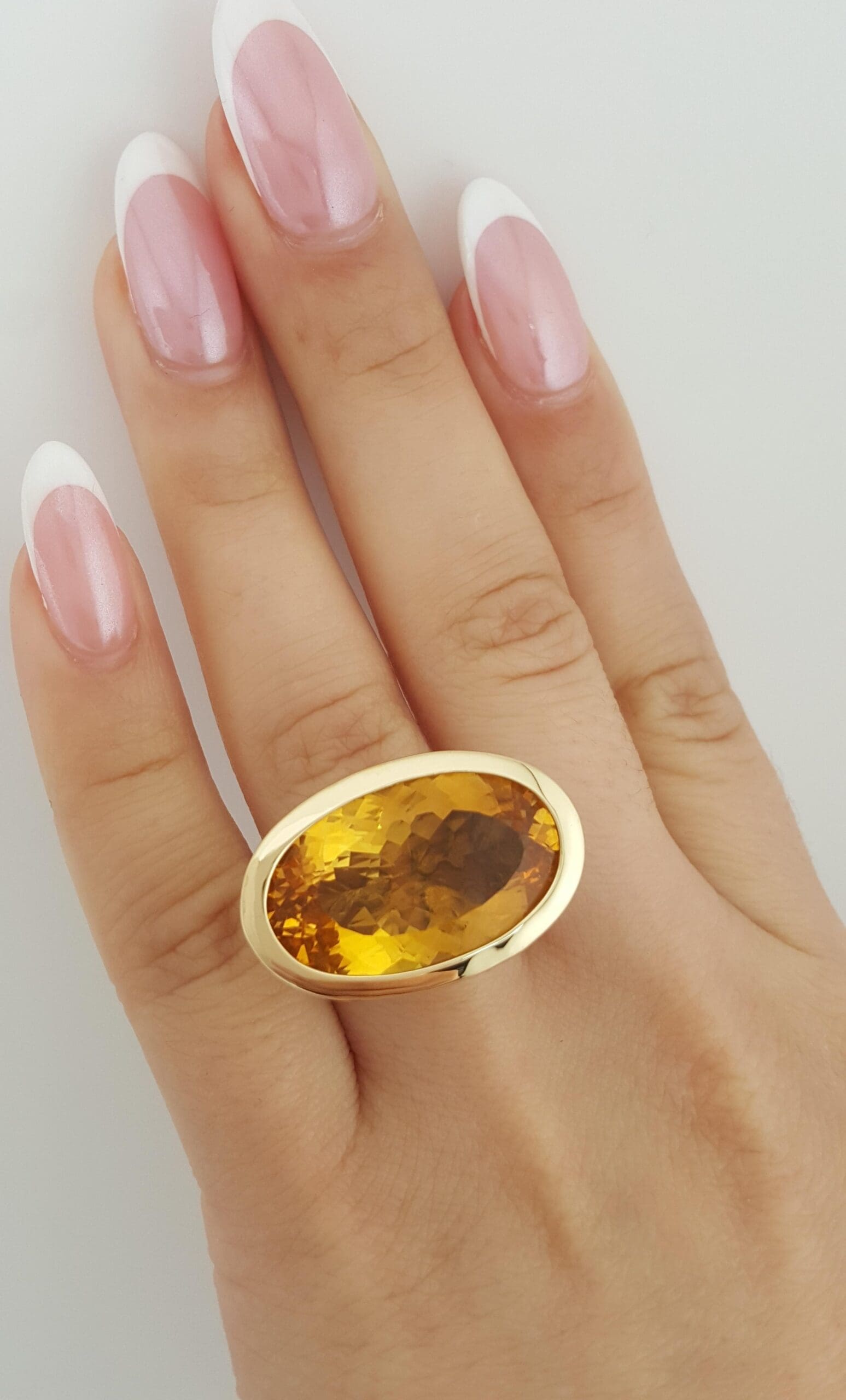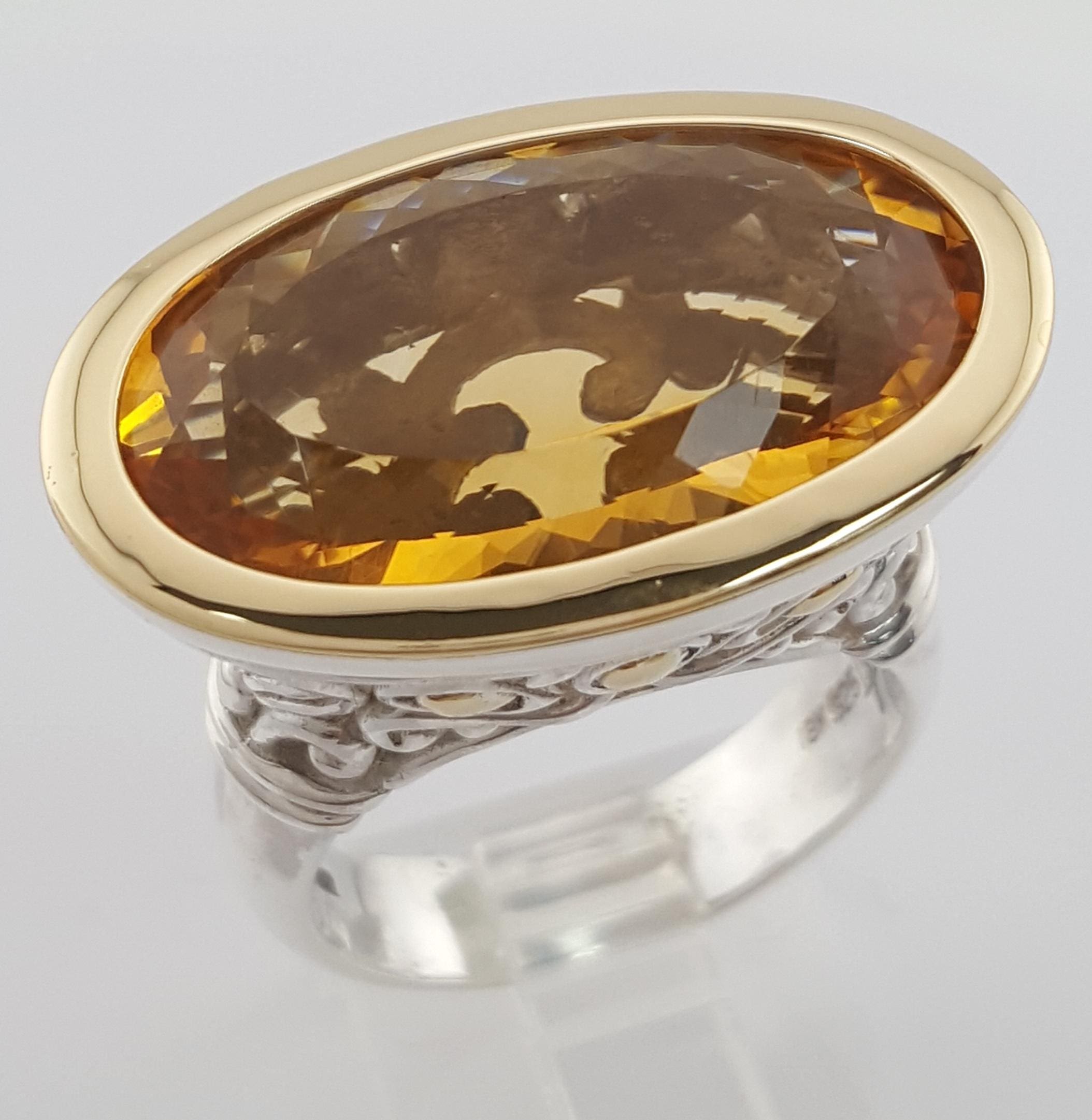 The ring weighs 16.2 grams, size 8.75, the center stone is an Oval Cut Jaisalmer Citrine . The top is 17.4 mm x 27 mm (LxW).