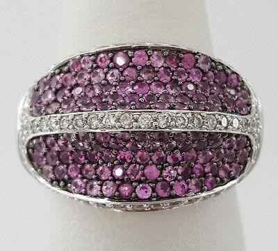 The ring weighs 11.2 grams, size 6.75, contains 120 Round Cut Pink Sapphire weighing 1.40 ct & 60 Round Brilliant Cut Diamonds weighing 0.50 ct, G-I in color, SI2-I1 in clarity.
