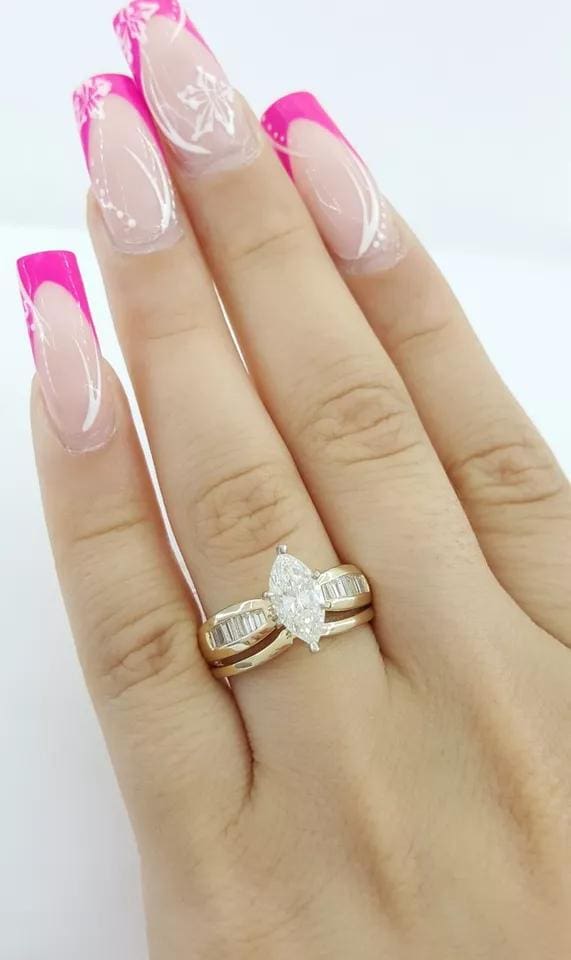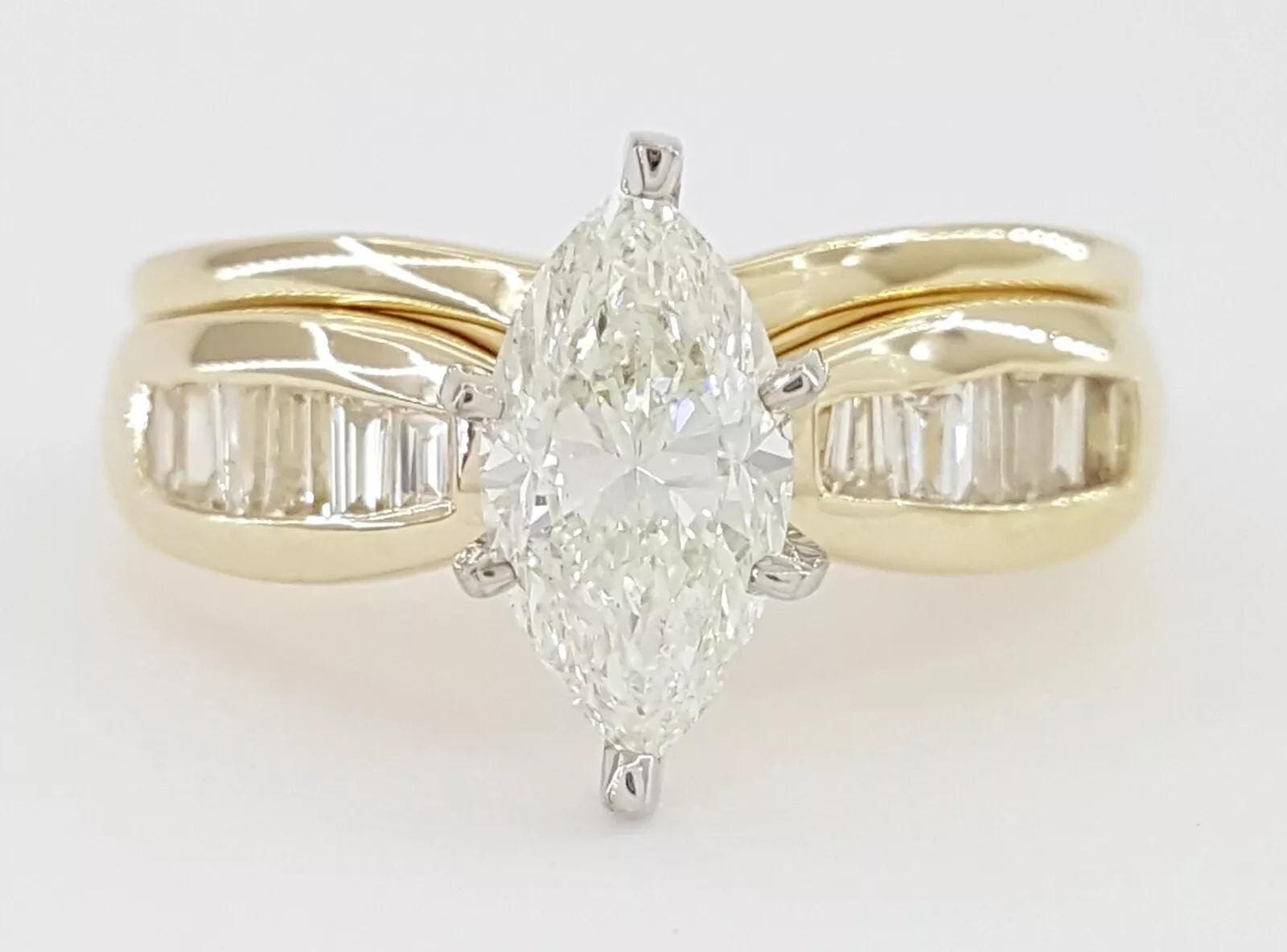 You are Purchasing 1.33 ct Total Weight Marquise Cut Diamond Engagement Ring & Wedding Band Set in 14k Yellow Gold.