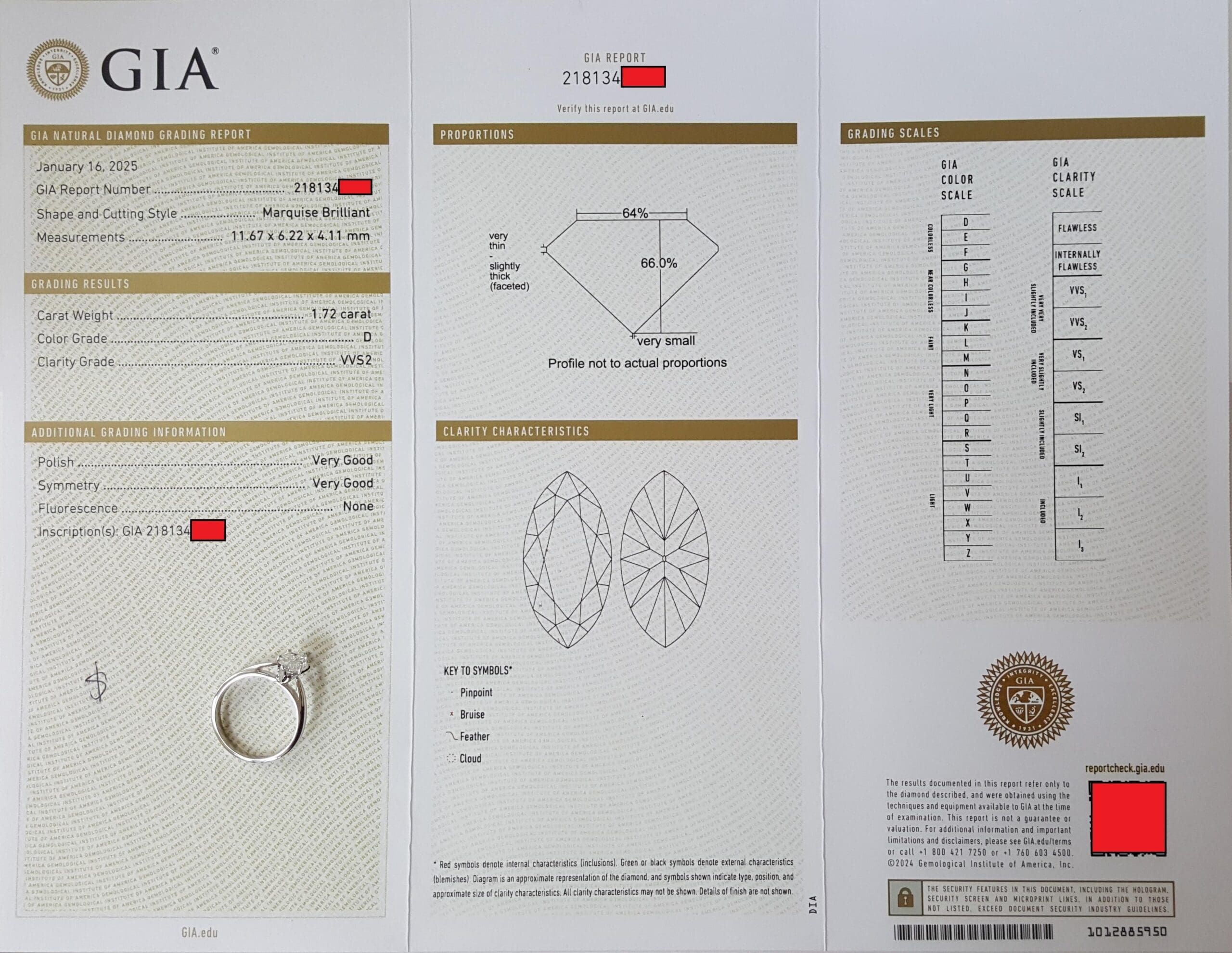 The ring weighs 5.7 grams, size 8.5, the center is a 1.72 ct Natural Marquise Brilliant Cut Diamond, D in color, VVS2 in Clarity, Very Good Polish, Very Good Symmetry, None Florence with measurements of 11.67 x 6.22 x 4.11 mm. The Diamond is graded by GIA: "GIA 218123****".