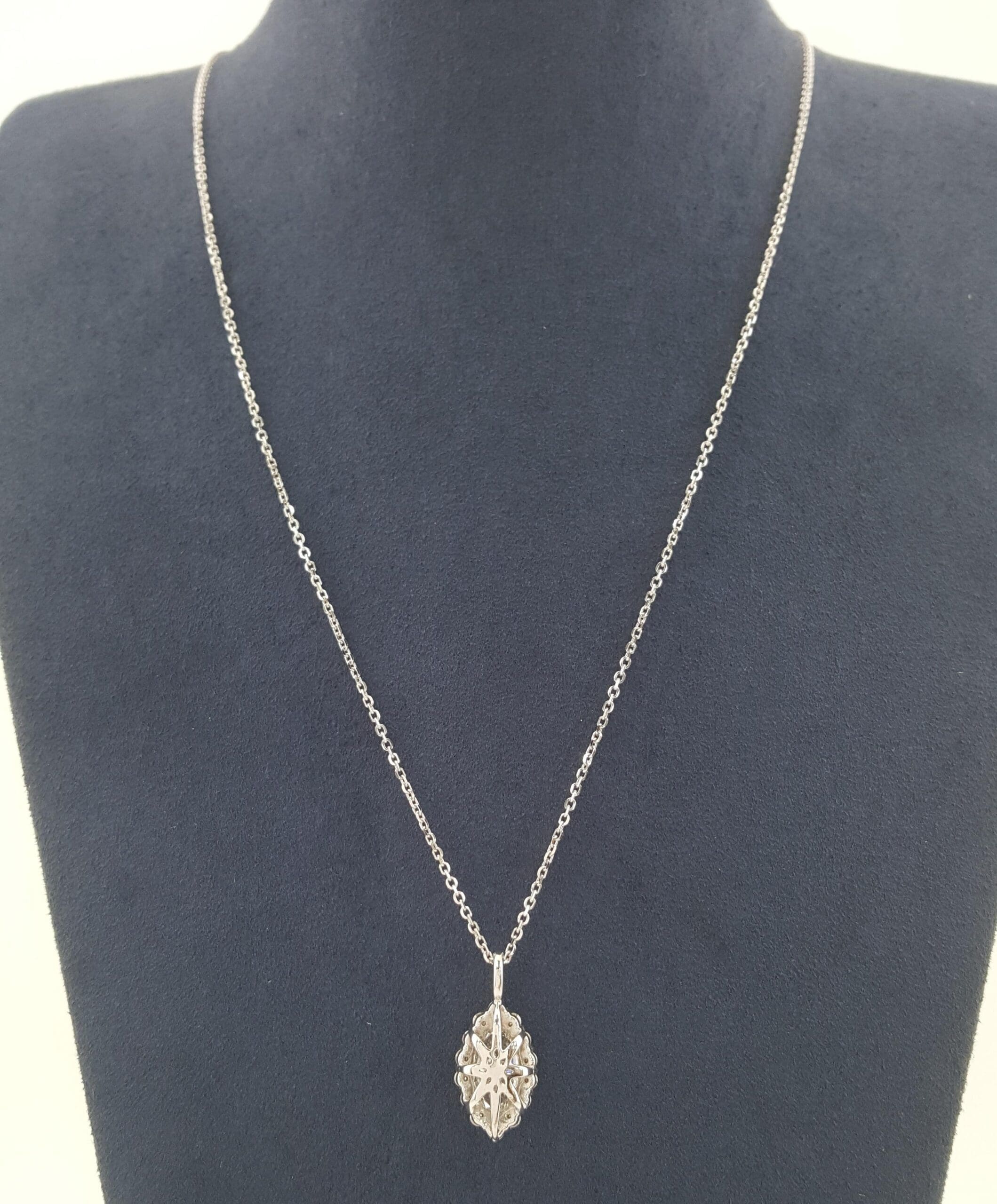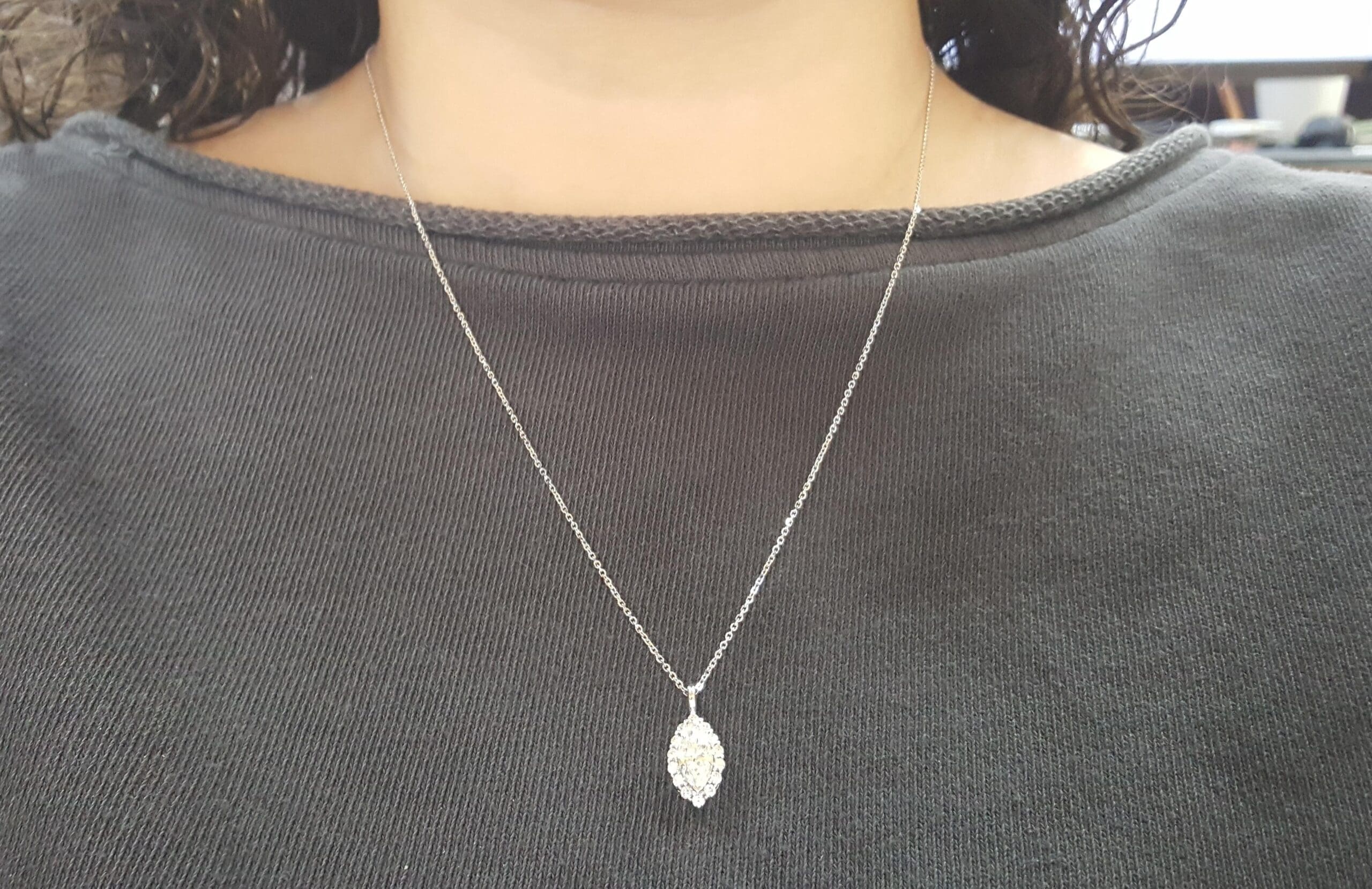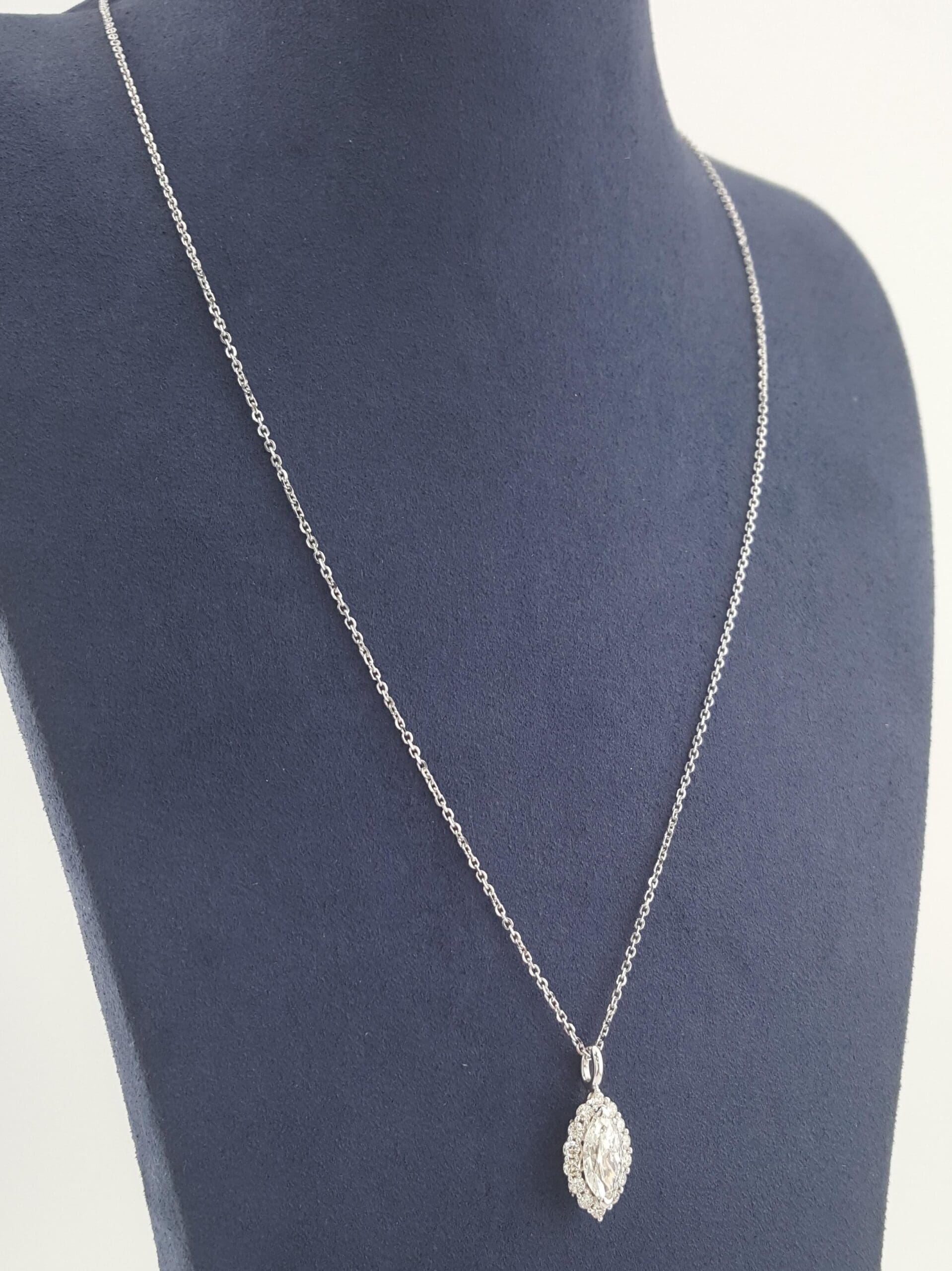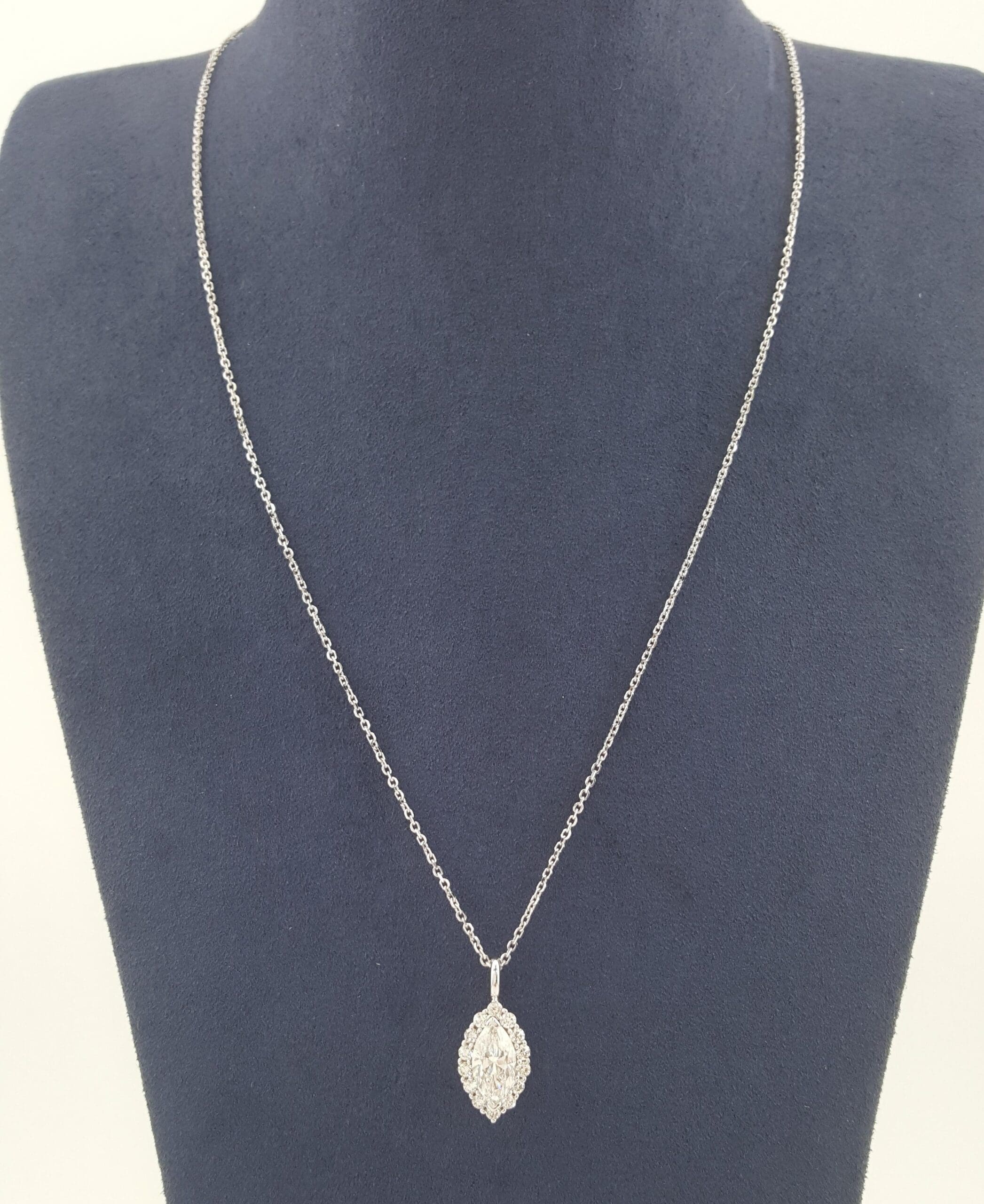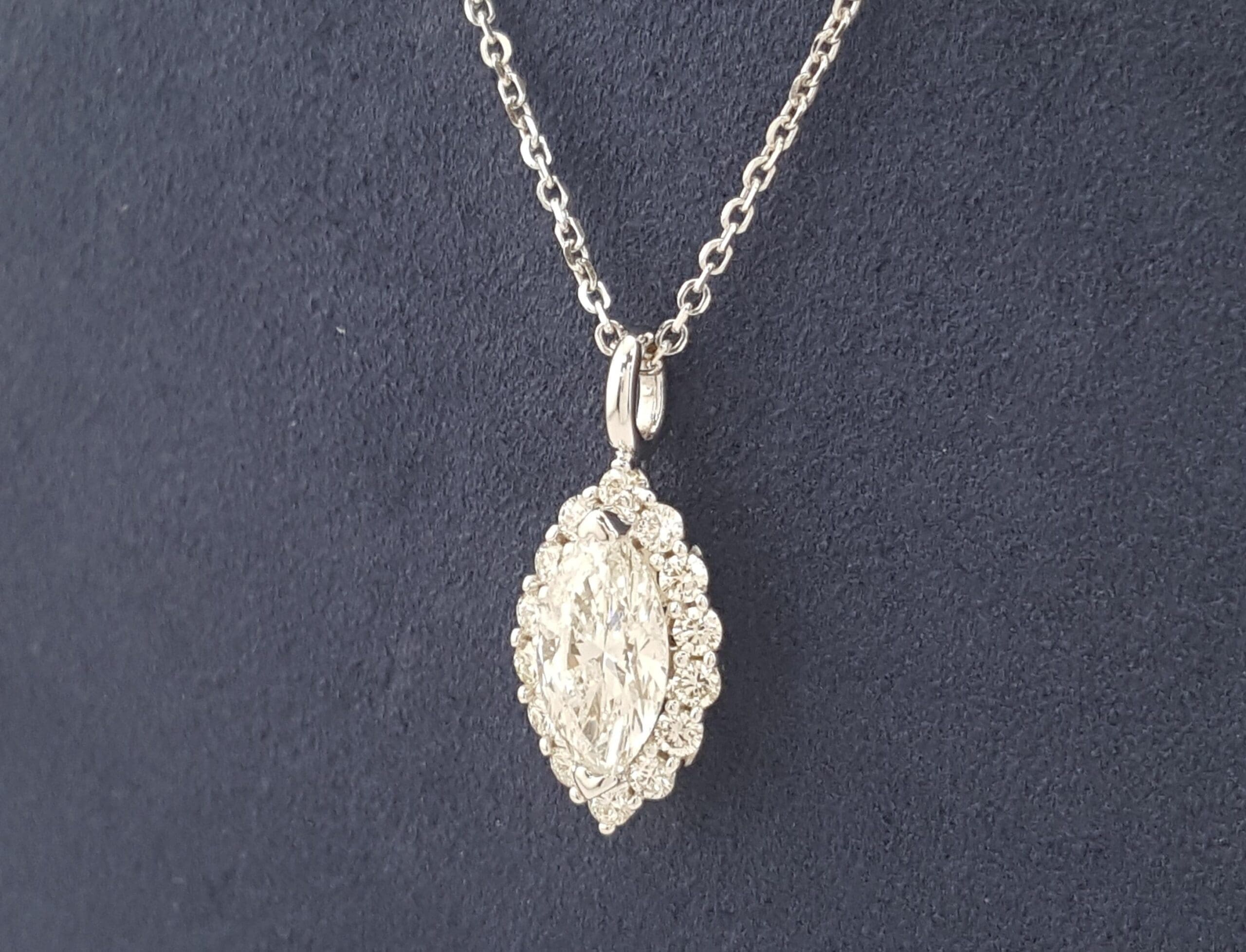The pendant with chain weigh 3.3 grams, 19.2 mm x 8.5 mm x 5.3mm (LxWxH) with a ~1.12 ct Natural Marquise Cut center Diamond, H in color, VS1 in clarity