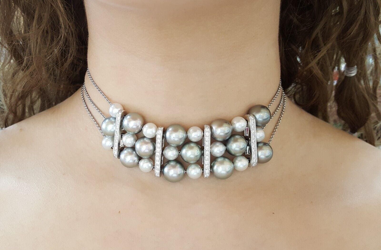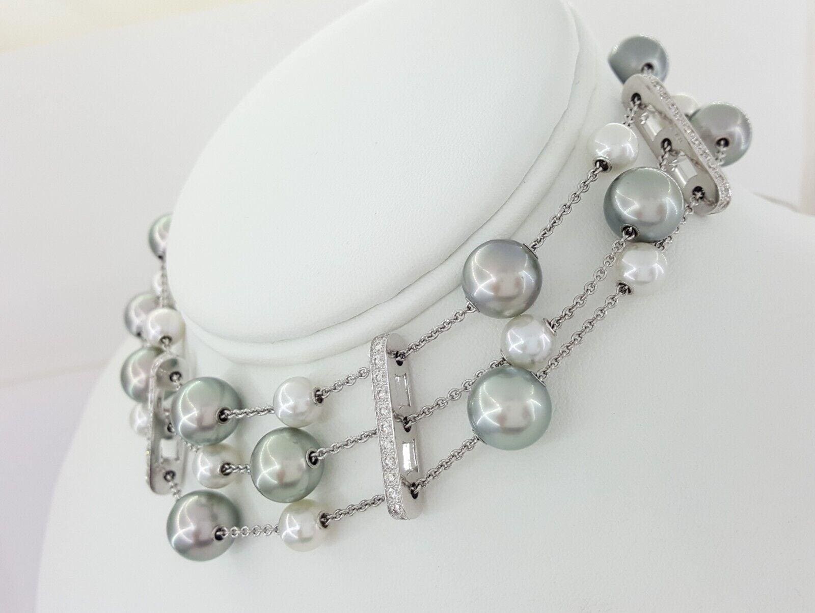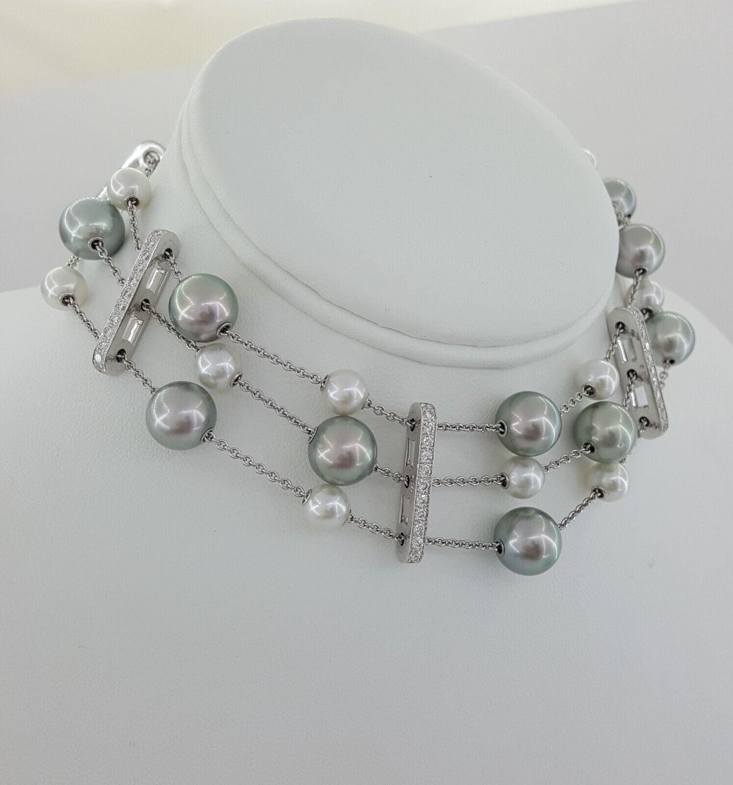 You are Buying an Mikimoto 18K White Gold 7.3-11.1 mm Grayish Silver & Cream Pearl 3-Strand Diamond Choker Necklace.