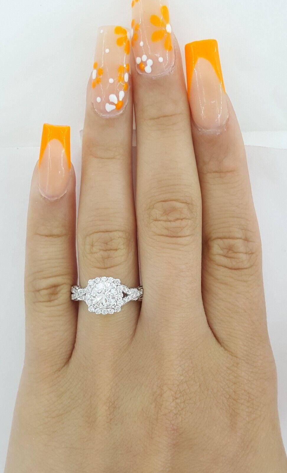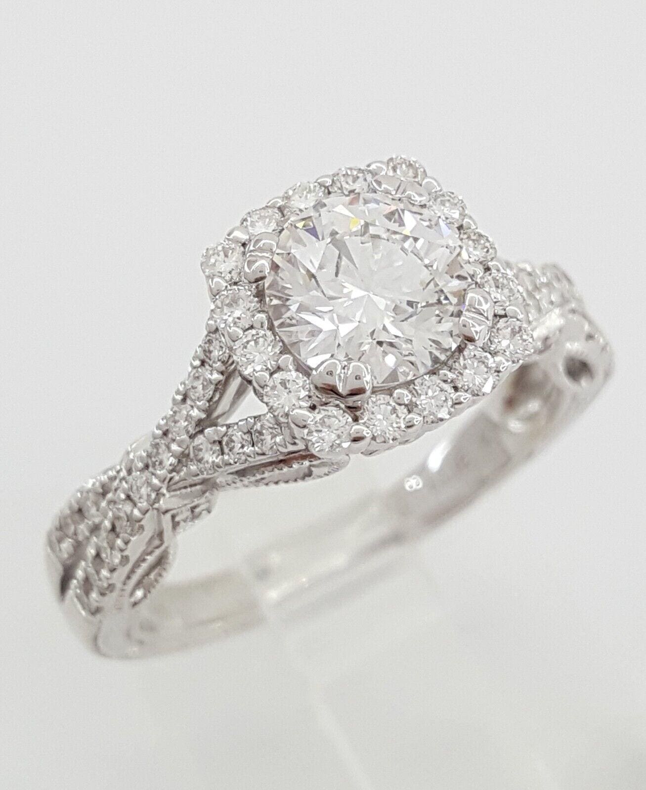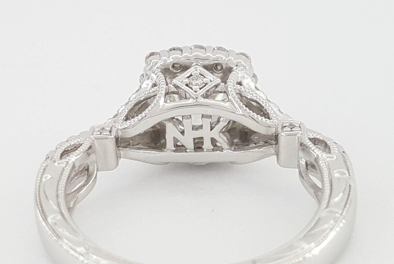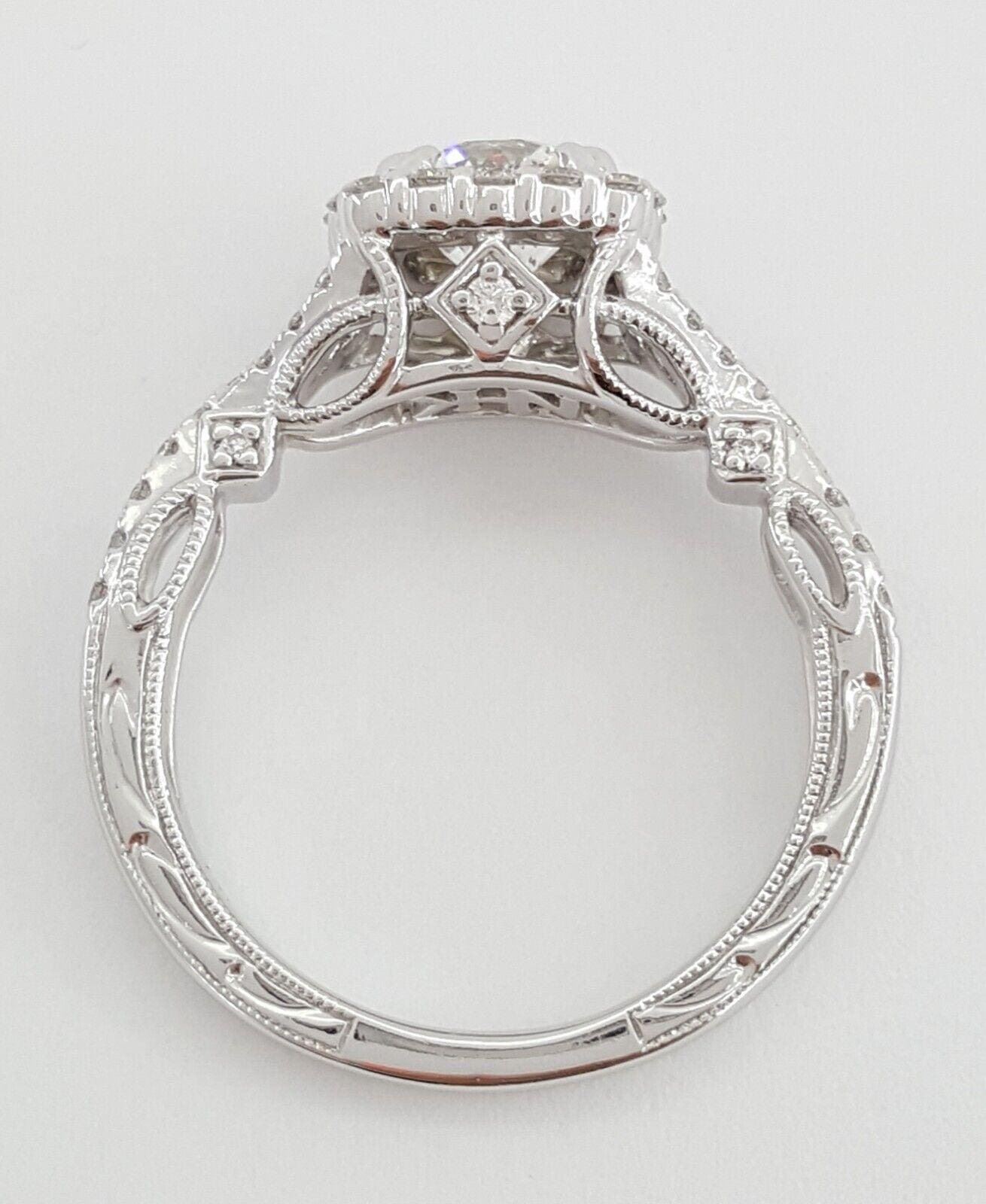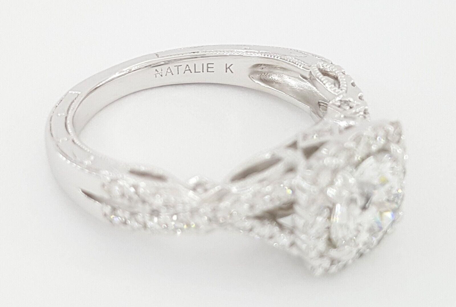You are purchasing a Natalie K 1.65 ct total weight Round Brilliant Cut Halo Diamond Crossover Hand Engraved Engagement Ring in 14k White Gold.