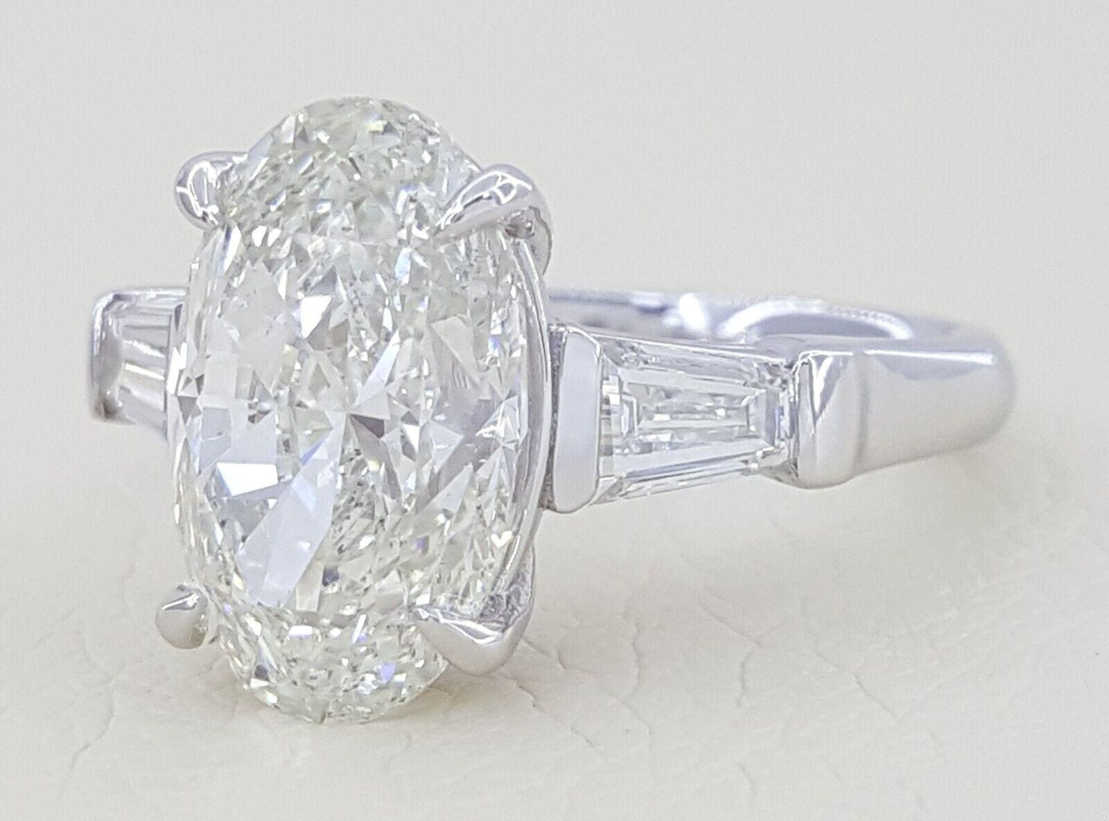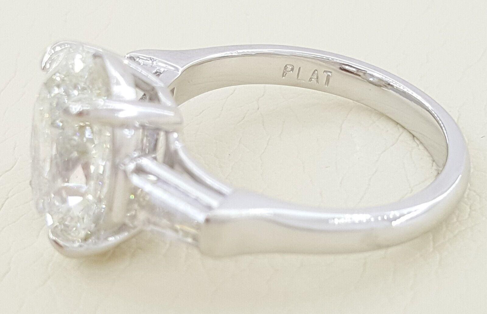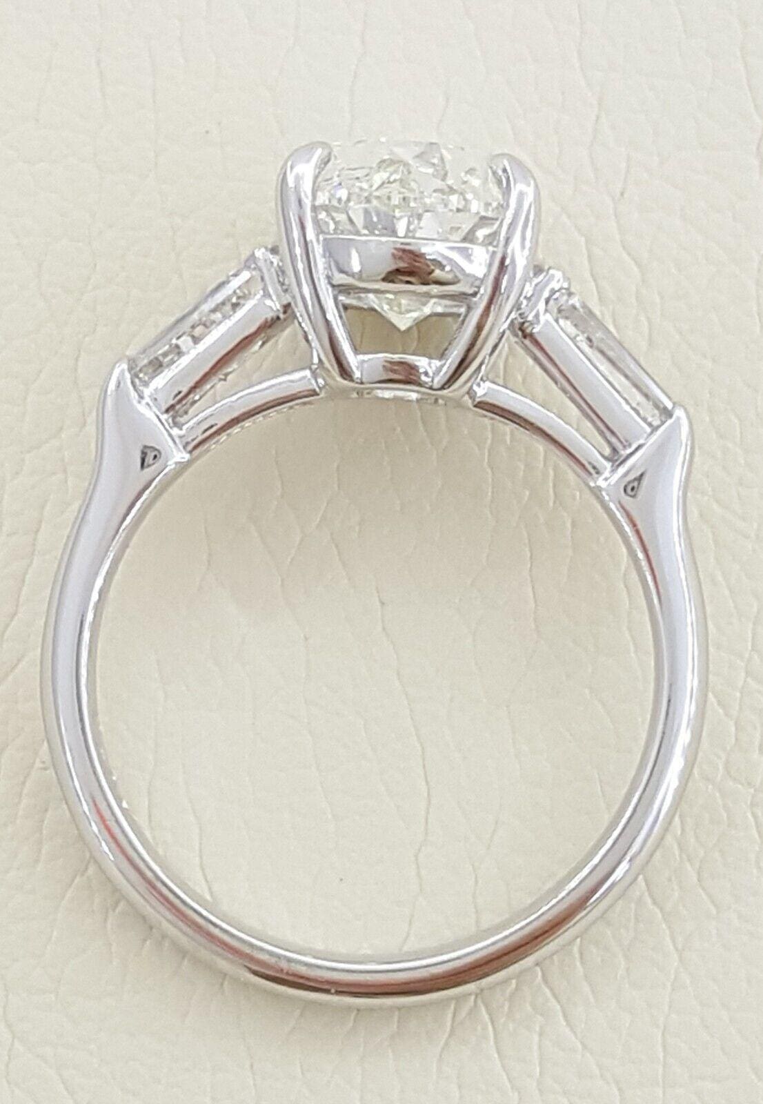 You are Purchasing a 4.39 ct total weight Platinum Pear & Tapered Baguette Shaped Diamond Three 3-Stone Engagement Ring. The ring weighs 7.3 grams, size 6, the center stone is a Natural Oval Brilliant Shaped Diamond weighing 3.77 ct, K in color, SI2 in clarity, Excellent Cut, Very Good Polish, Excellent Symmetry & None Fluorescence. The measurements of the center diamond are 12.84 x 7.92 x 5.30 mm.