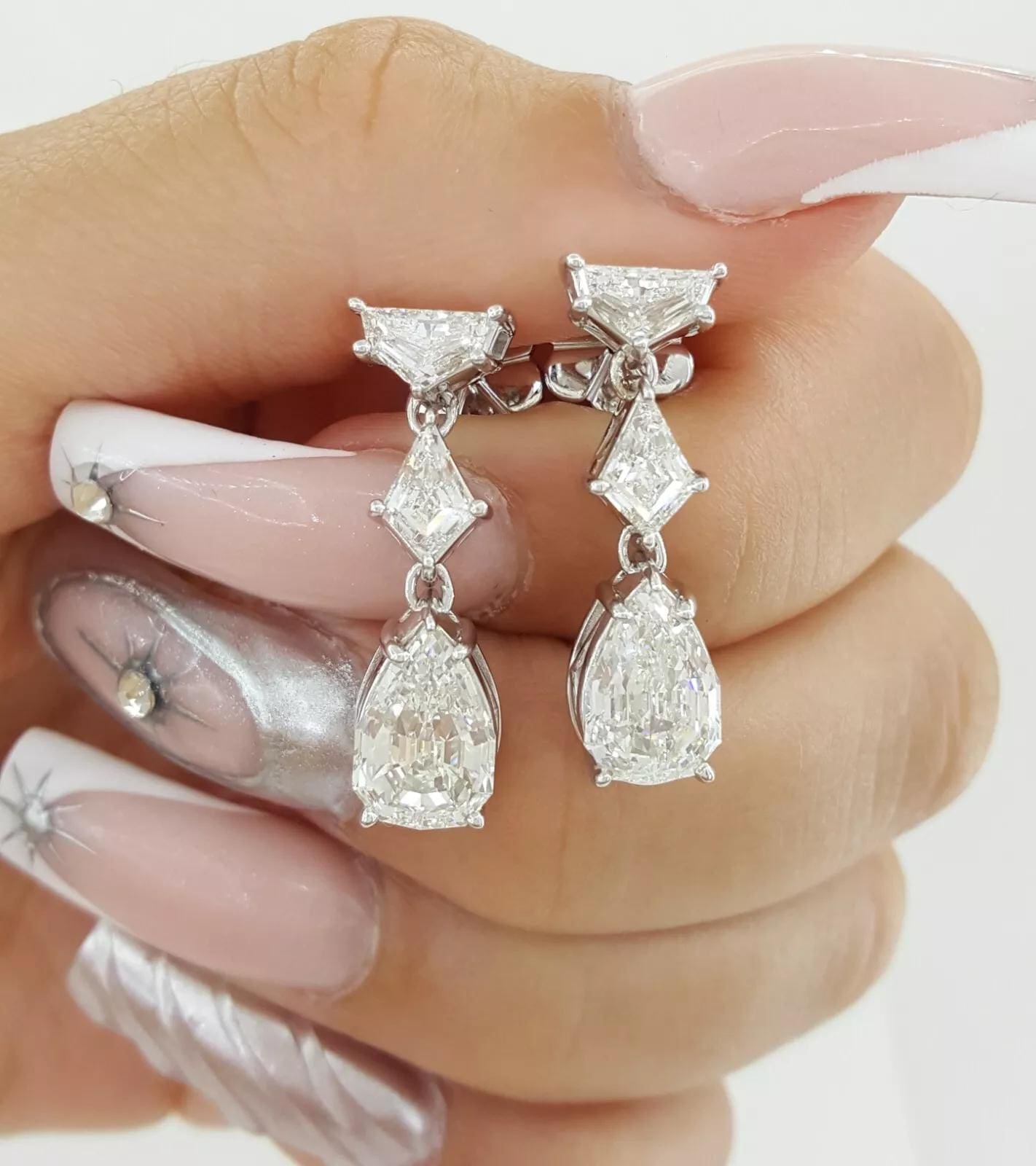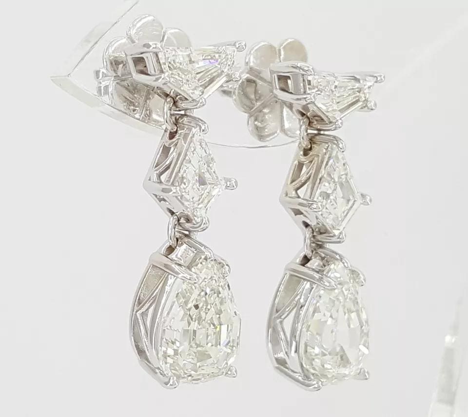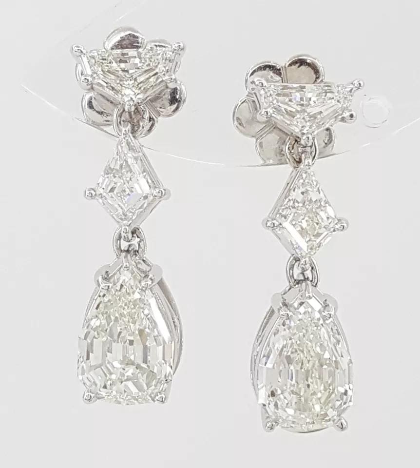 The earrings weigh 7.7 grams, there are 6 Natural Pear Shield & Kite Cut Diamonds weighing 5.66 ctw, G-I in color, VVS1-VS2 in clarity.